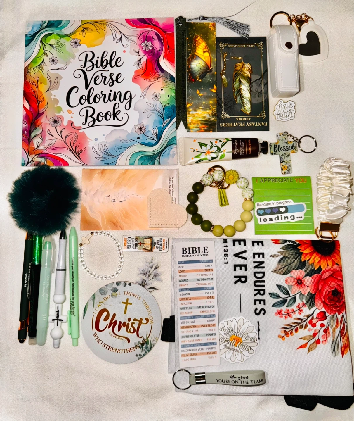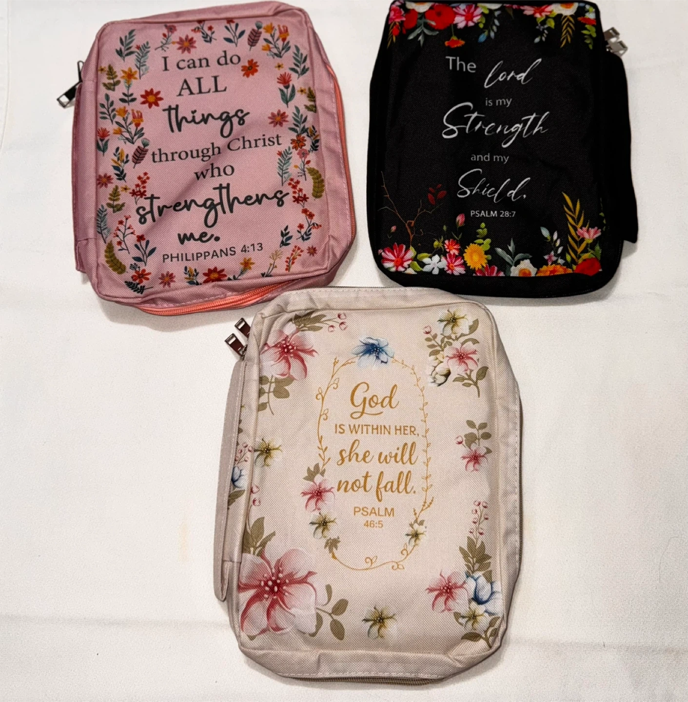 Larger packages may include wallets, tote bags, daily devotional books, coin purses, Bible Books, zipper pouches
