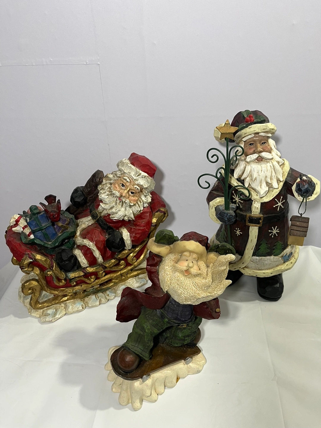 Selling a set of three Santa Claus figurines. They are in good condition and would make a great addition to your holiday decor!