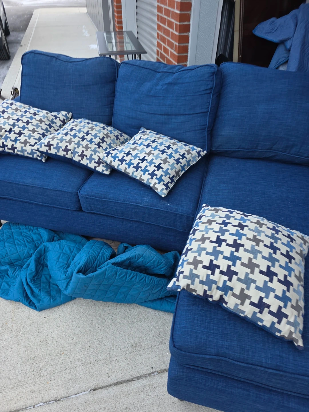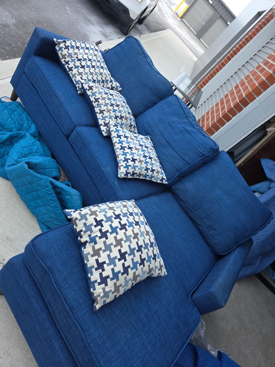 Selling a comfy blue sectional sofa that's in great shape! It comes with the pillows pictured. Perfect for a living room or den just been wrapped in storage