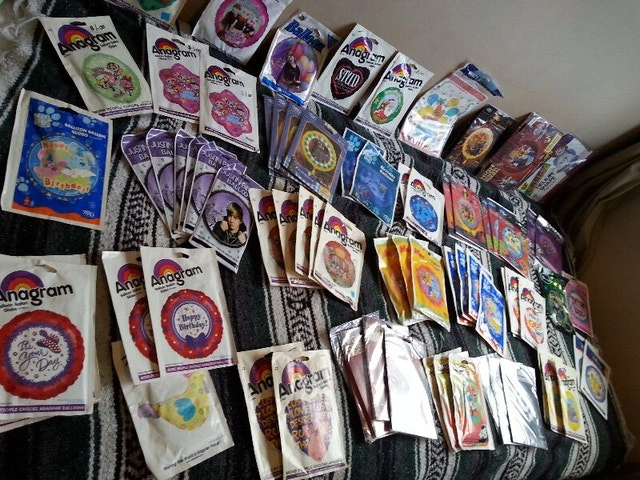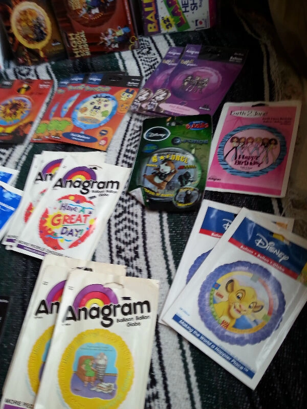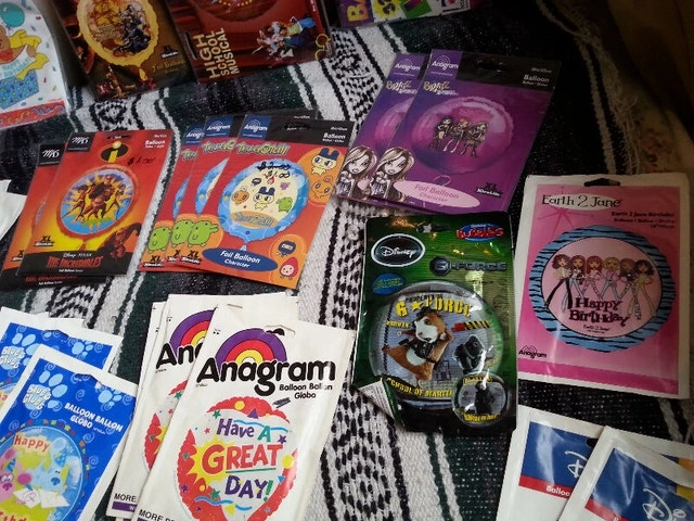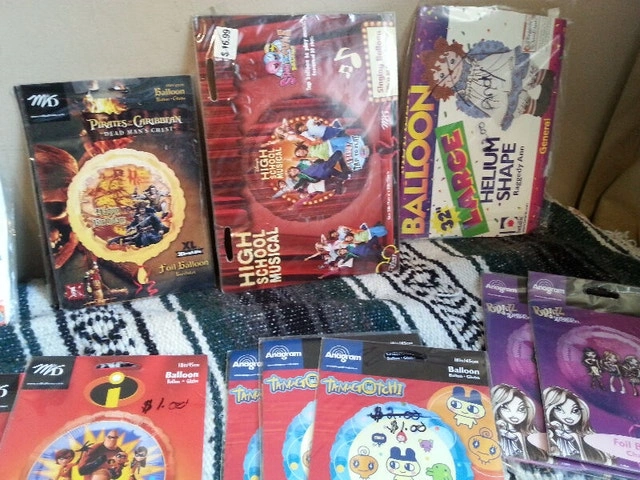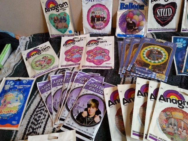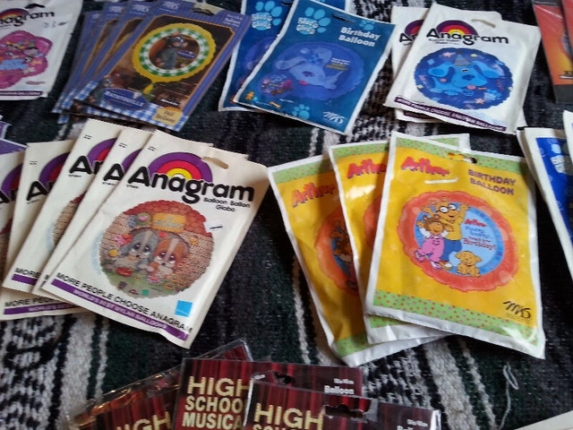 Up for sale are 80 new foil character balloons, 18 inches in diameter. Included are: 7 x High School Musical (one being 28 by 28 inches singing "We are All In This Together"), 6 x Justin Bieber, 6x Blue’s Clues cat Happy Birthday, 6 x It’s Your Birthday, 5 x I’m Sorry, 4 x Arthur Hooray Hooray Today Is Your Birthday, 4 x Ratatouille, 3 X They’re Perfect Charles, I’ll Think of You Every Time I Wear Them (comic strip), 3 x NHL, 3 x Have A Great Day, 3 x Hurbie The Love Bug, 3 x Tamagotchi, 3 x The Power Girls, 2x Lion King, 2x Pirates Of The Caribbean, 2x Happy Birthday, 2x Bratz, 2x Love Lust Desirer Passion (pig), 2x Blue Dog Guess Who’s Wishing You Happy Birthday, 2x Blue Dog, 2x The Incredibles, 2x Earth 2 Jane, 1x You Chick, 1x G Force, 1x Happy Birthday from The Gals, 1x Miss You, 1x Have A Delightful Birthday, 1x Merry Christmas, 1x Stud, 1x Raggedy Ann (32 inches), and one package of Happy 1st Birthday Loot Bags. All 81 packages are new and sealed. Some of these balloons are rare and hard to find, mostly from the 1990s or before but still 100% usable. If interested please contact Michel at 613-709-3013. Thank you!