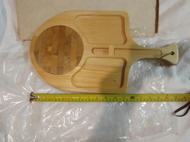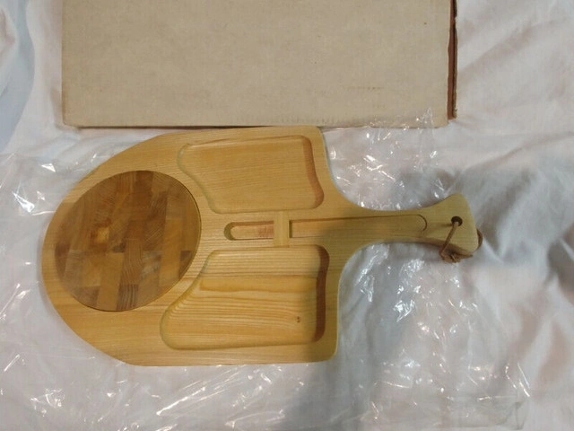Up for sale we have a New Vintage Wood Cheese cutting board made with Japan Wood made in Japan. The board is 18 inches by 10 inches in brand new condition. It has an insert on the board to put a knife. I have 2 for sale at $25 each. You won't find anymore like these for sale, 2 of a kind.