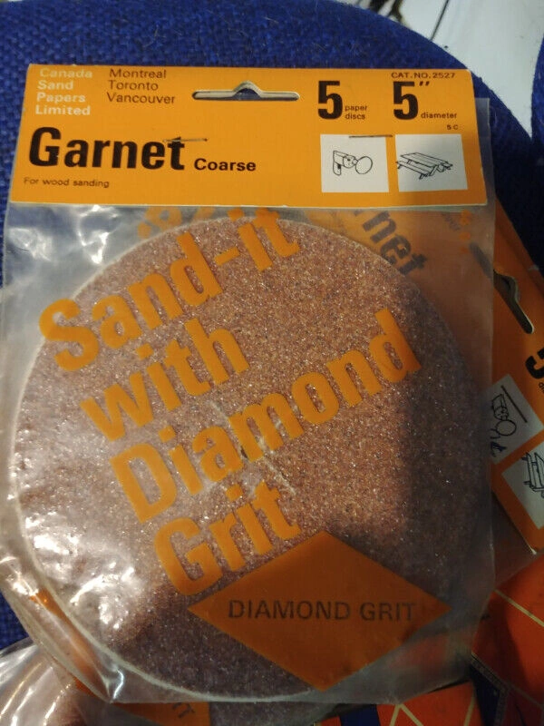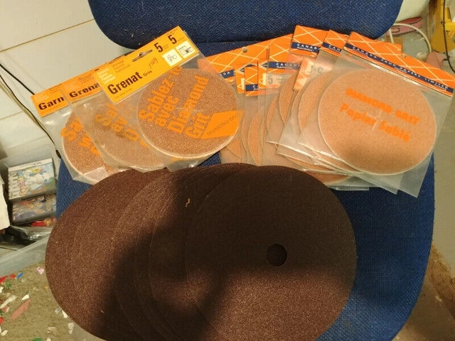 Up for sale we have this lot of round drill or other electric tool sand paper we have 3 package of 5 sheet of coarse , 10 package of 5 sheet of medium and 19 heavy gauge sheet of 7 “ coarse 60 grit sand paper 84 round sheet coarse 60 grit & medium Drill sand paper 5, 51/4, 7 inches
