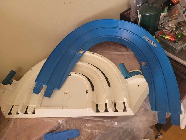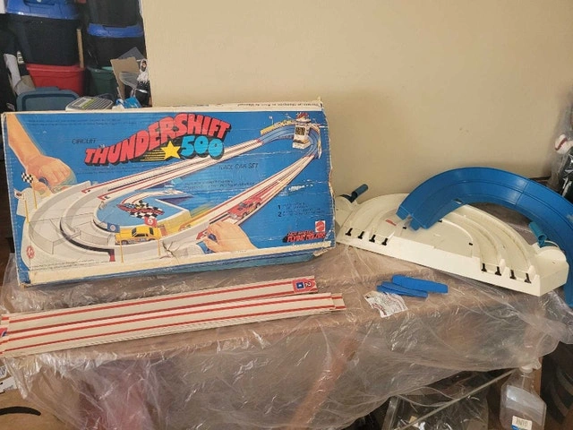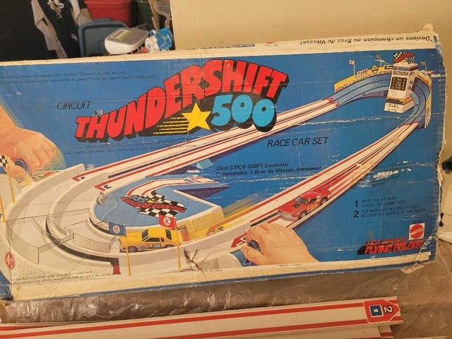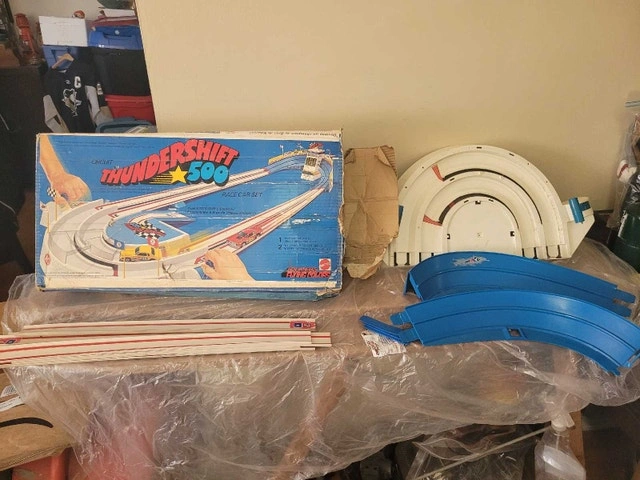 This is the 1974 Hotwheels Thunder Shift 500 Race Car Parcial Set what you see is all I have. 2 tracks are chip at one end photo box is in pretty bad condition but the graphics are still very bright and niceties power booster are in great working condition asking $50 pick up on beaverbrook lane Kanata thank you