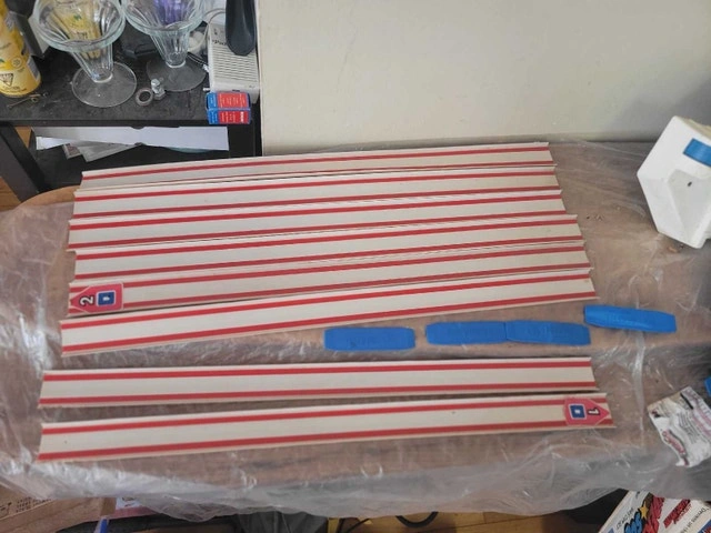 This is the 1974 Hotwheels Thunder Shift 500 Race Car Parcial Set what you see is all I have. 2 tracks are chip at one end photo box is in pretty bad condition but the graphics are still very bright and niceties power booster are in great working condition asking $50 pick up on beaverbrook lane Kanata thank you