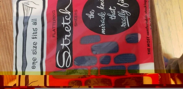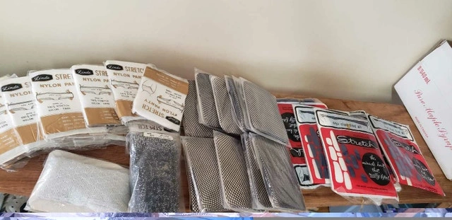 UP FOR SELL WE HAVE THIS VINTAGE LOT OF WOMEN CLOTHING. WE HAVE 20 PAIRS OF LINDA STRETCH NYLON PANTY SIZE 4 TO 6X I BELIEVE THESE ARE FOR A CHILD JEXT WE HAVE 12 PAIRS OF BLACK FISH NET SOCKS, 2 PAIRS OF GOGO SEXY SHEERS AND 5 PAIRS OF NAVY ONE SIZE FITS ALL FLATTERING STRETCH SHEERS STOCKING ALL ARE BRAND NEW ASKING $20 FOR THE LOT PICK UP ON BEAVERBROOK LANE IN KANATA THANK YOU