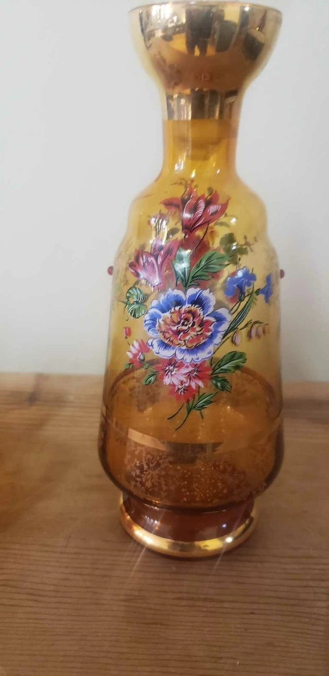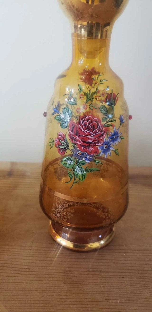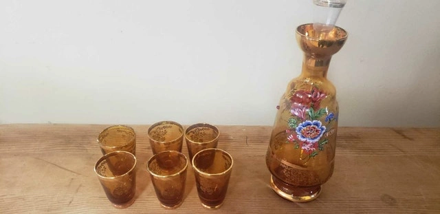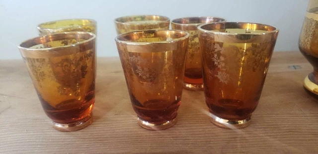 This is a beautiful venetian amber decanter and glass set. It is in very good condition with the only noticeable item being a clouded stopper. This could be a pin hole in the blown glass that just adds to the "patina" of the vintage set. The decanter is 3.5 in wide x 9.5 in tall with stopper in place. The glasses are 1 7/8 in wide x 2.5 in Tall