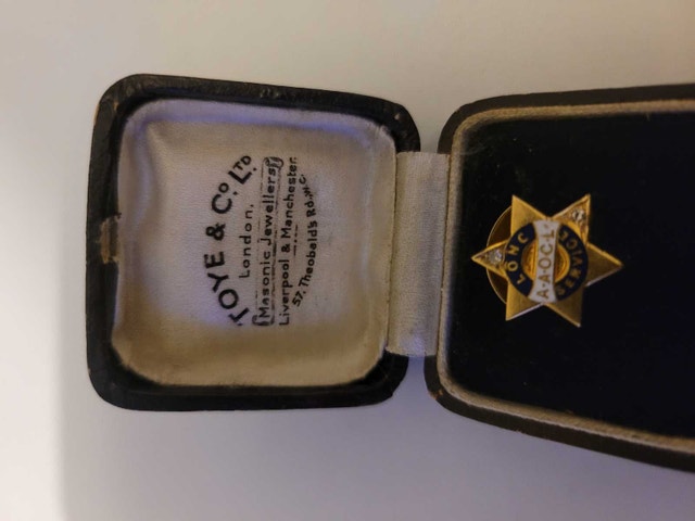 An 18ct gold collar stud with enamel decoration set with 2 diamonds and awarded for long service, diamond set AAOCL long service badge, the screw back marked '18k. approx. weight 3.6g 18 CARAT GOLD PIN IN ORIGINAL LEATHER BOX, 1925 Description 3.6 GRAMS WITH TWO DIAMONDS ENGRAVED D. CAMERON, 1925. ASKING $600 PICK UP AT THE OPP POLICE STATION PARKING LOT ON CAMPEAU STREET IN KANATA THANK YOU........... This is a vintage gold and enamel long service award lapel pin, dating to the mid-20th century. It features the letters "A-A-OC-L" and the word "LONG SERVICE" around a central star design. The pin is housed in its original presentation box from Toye & Co Ltd, Masonic Jewellers in London, Liverpool, and Manchester. Similar service pins from that era were often made of gold. The exact company or organization represented by the "A-A-OC-L" initials is not specified in the available information.probably oil company presentations 'E.P. Co. Ltd' and 'A.A.O.C.Ltd',
