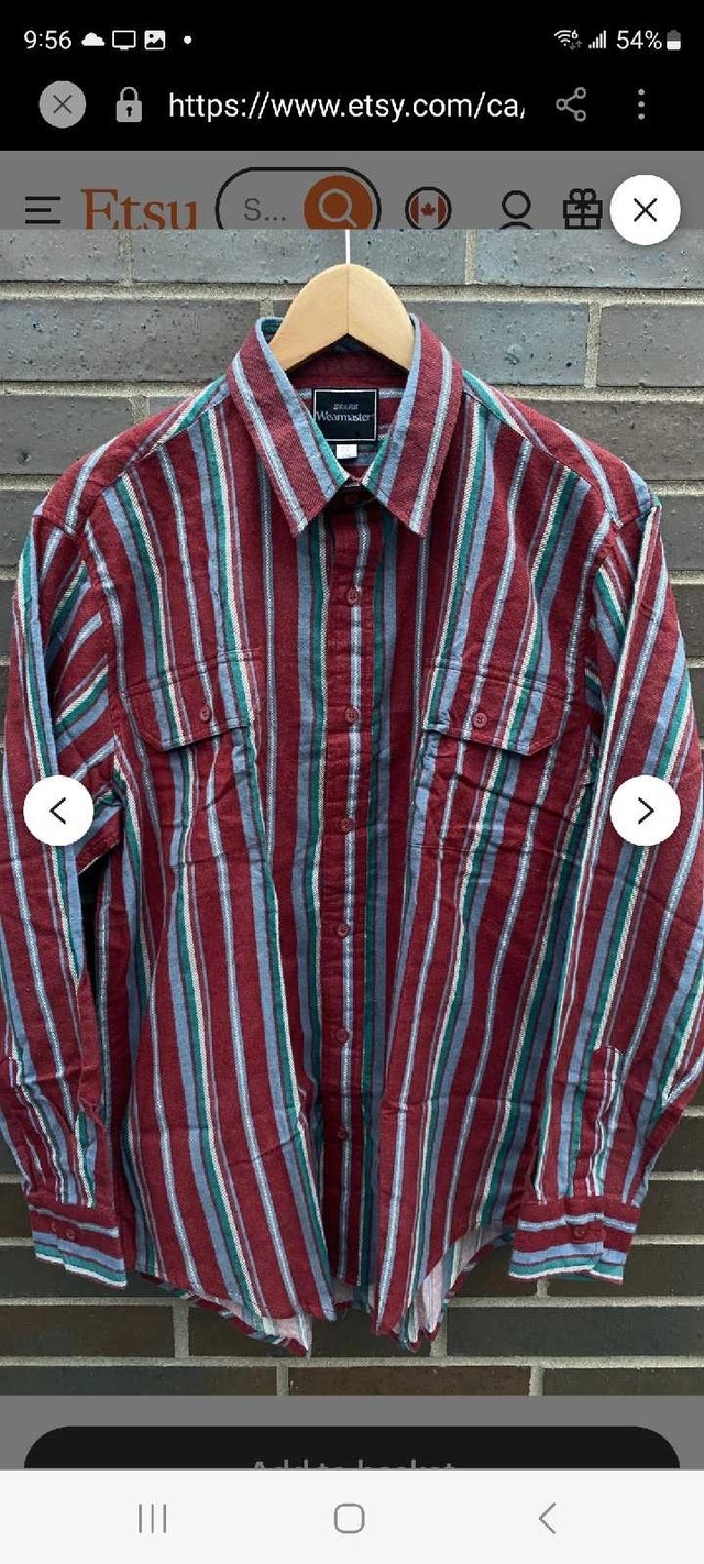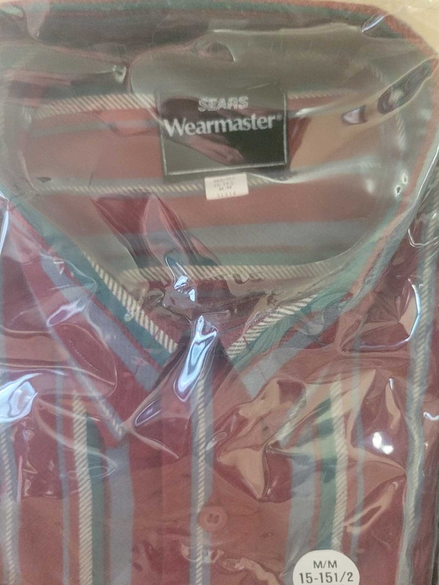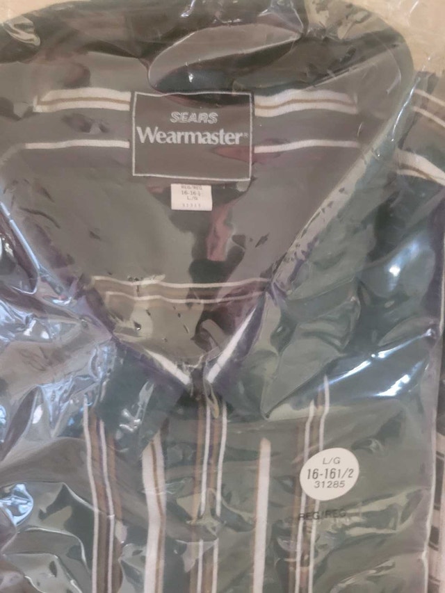 Vintage 80s Sears Wearmaster Button Up Shirt / 1980s Button Up / Vintage Dress Shirt / Button Down / Made In USA In size medium, Large and extra Large all in new condition. 1 LARGE IS FROM JUST IN AND 1 extra large BUT from COLUMBUS CLOTHING THE STRIPPED BLUE , RED AND GREEN ARE FROM SEARS asking $30 each the 2 photo with the Shirt on display was past and copied from Etsy pick up on beaverbrook lane Kanata . Size Large (Length 31” Chest 22”)