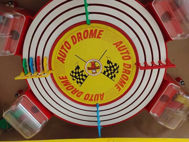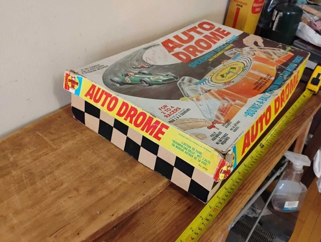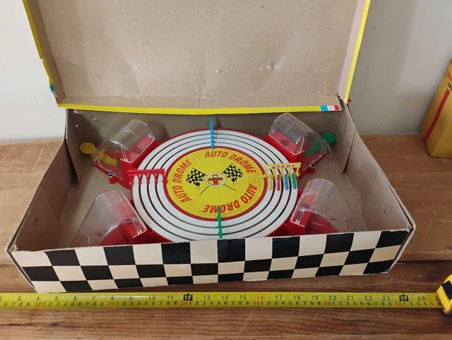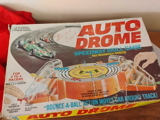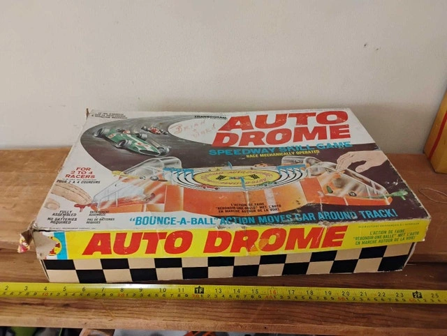 For sale is this Vintage 1967 Transogram 3770 Auto Drome Speedway Racing Car Skill Game in Original Box. The box as seen better days but still looks good asking $35 pick up on Beaverbrook Lane Kanata thank you Action packed racing game from Transogram… players shoot the ball bearings into holes to advance their car. In very generally very good condition, though the green lever has been repaired with tape… could do a much better repair, and the decorative plastic overpass parts are missing. Very nice box, sharp racing graphics, one split corner (see photos). Missing