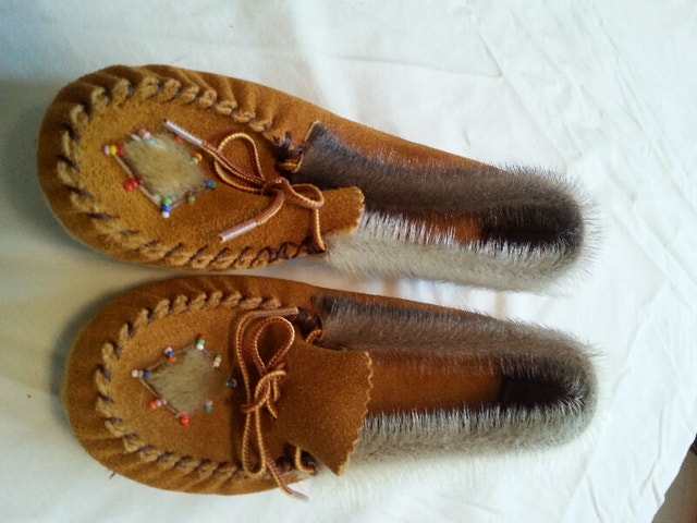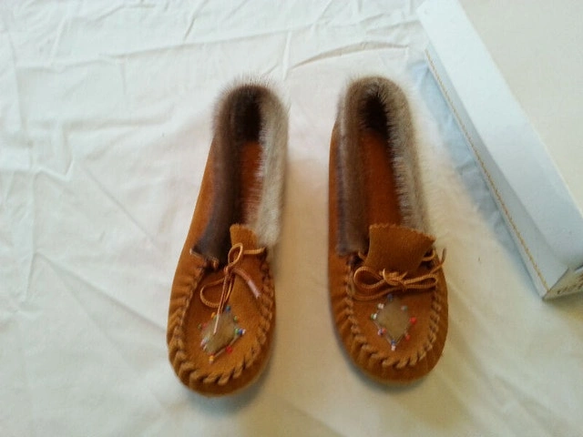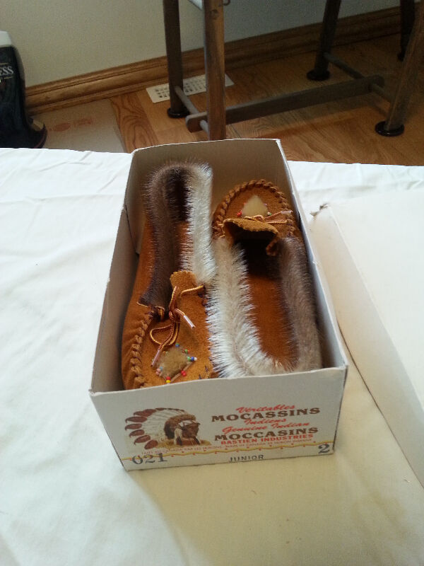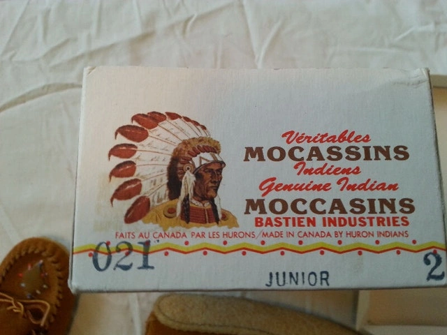 Up for sale is a Vintage Brand new Pair of Leather Beaded Native American Indian Child Moccasins slippers Hand Made in Canada by Real Huron Indians and distribute by Bastien Industries . This is a size 2 child they are 8 inches long come is original box with great looking graphics . The Top of the box as a broken corner and a small fold to the bottom (photo) thank you