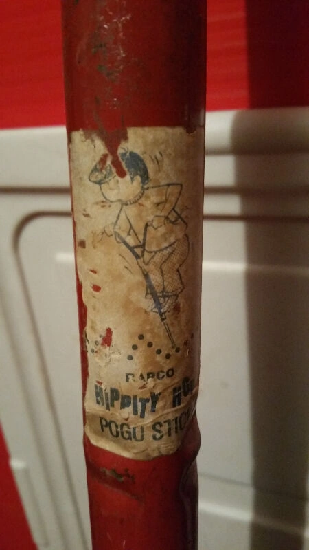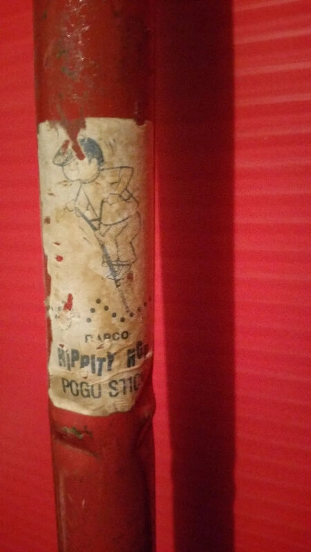 Up for sale, a vintage pair of Pogo Sticks. One is a Rapco brand pogo stick. All metal with black rubber/plastic handles, foot pedals, and knob on bottom. Red color with silver matte metal accents. Measures 45 inches high & 17 1/2 inches across handlebars. Light sporadic surface scuffing & light surface rusting/discoloration at bottom. The other is a Hippity Hop Vintage Pogo Stick, 1965 Jumping Stick. The springs are really strong in both of them. If interested please contact Michel at 613-709-3013 thank you