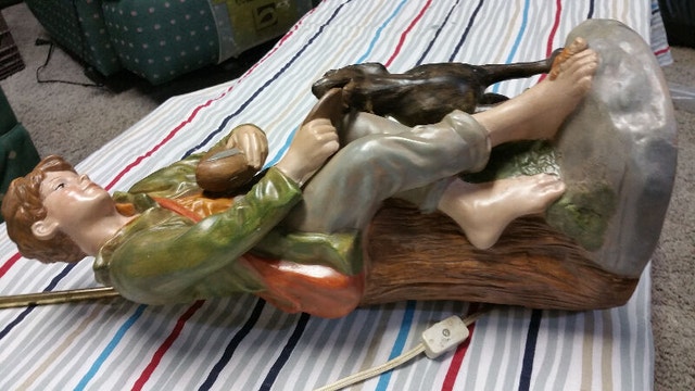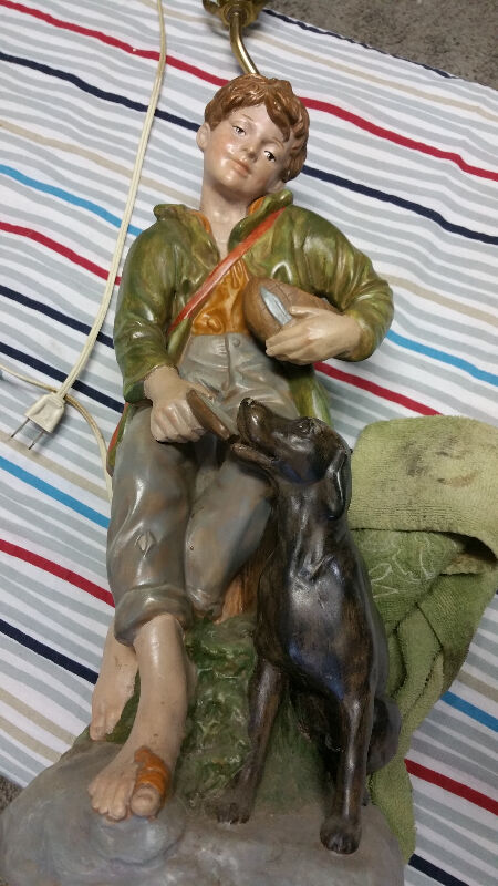 Vintage Huckleberry Finn table lamp in great condition. It measures about 17 inches high at the top of the head and 25 inches high at the lite, the base is 8 inches by 7 inches. It has a very small ding (see photo).