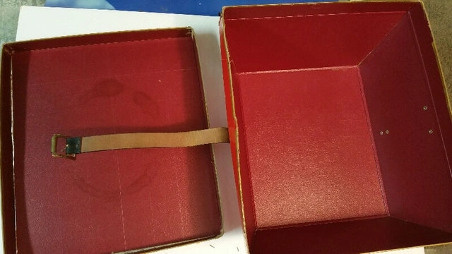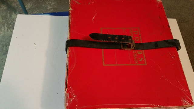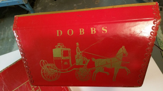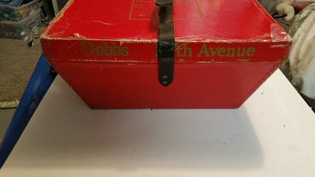 Vintage Red Dobbs Fifth Avenue, New York Hat Box with a black leather and brass band. Very dashing! The top of the box is broken but could be easily taped back on. There is a bit of wear on the edges/corners of the box, as would be expected of an item of this age. Please refer to photos for details. The box widens at the top, and measures 15" x 13 1/2" at the top and 12 by 10 “ at the bottom by 7” high. The red box has a leather belt with brass-buckle to secure the top to the box.
