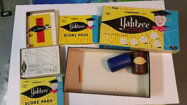 * 1973 ES Lowe Yahtzee Game (dated 1973, box has a rip in one corner but still in great condition, comes with extra cards and cup in near mint condition)