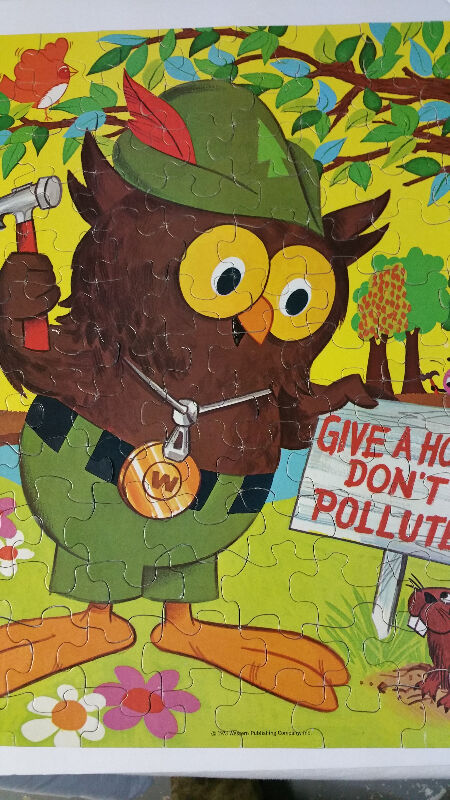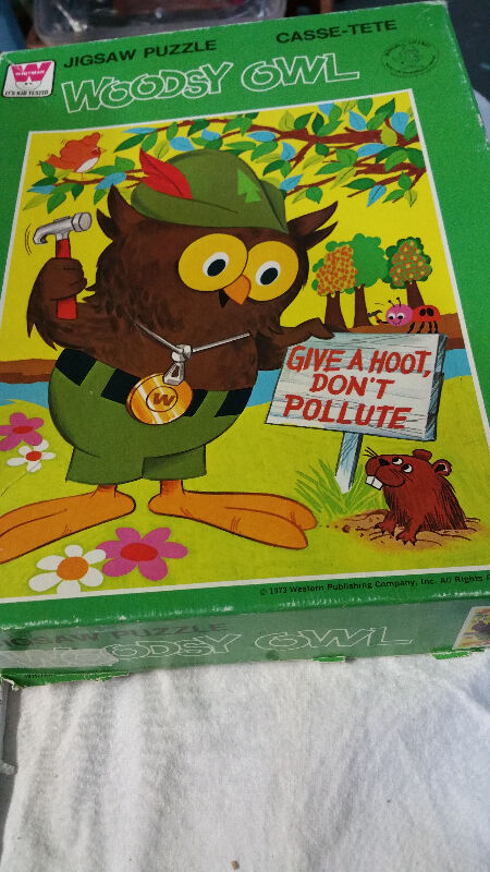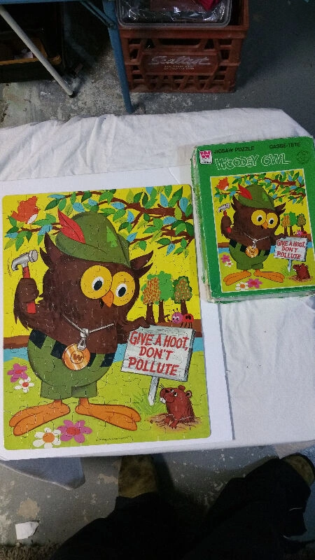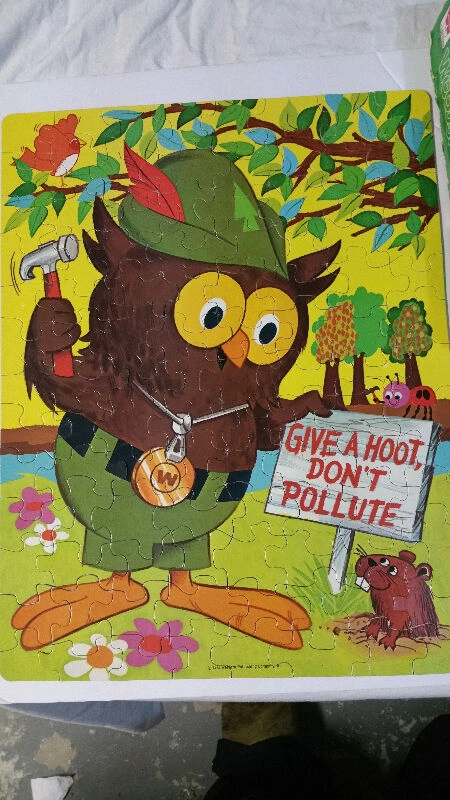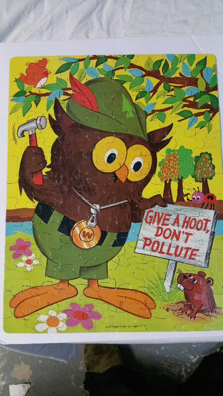 Up for sale we have this Vintage WOODSY OWL Jigsaw Puzzle Whitman 1973 100 Pieces 14"x18" Give A Hoot, Don’t Pollute Forest Adorable puzzle in great condition! Box shows some wear with tape in 2 corner and 1 rip one .Great collectors item Asking $30.00 if interested please contact Michel at 613-709-3013 thank you