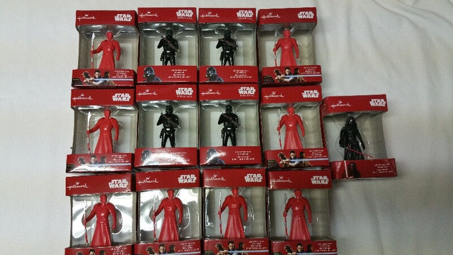 Up for sale we have a lot of 13 Hallmark Star Wars Christmas Tree Ornament. The 4 red guys are praetorian guards, the black troopers are “death trooper sand 1 Black Kylo Ren character All in New condition never open Asking $130.00 for all 13 if interested please contact Michel at 613-709-3013 thank you
