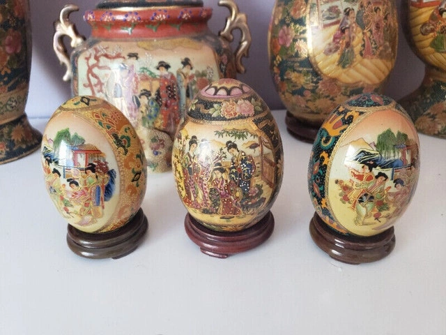 7 Set SATSUMA Vase Bowl Eggs Hand Painted Enamel