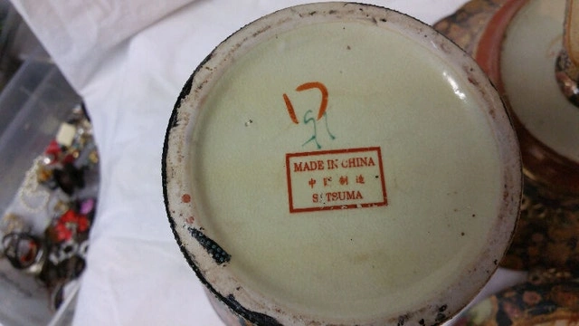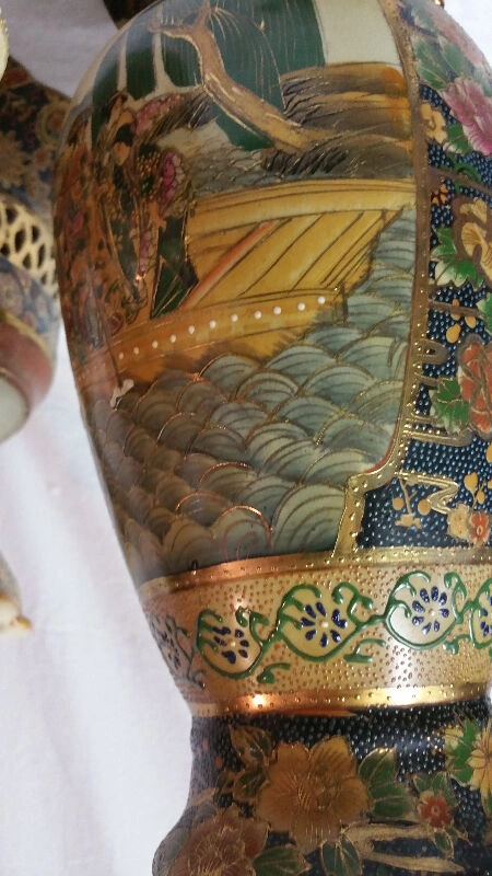 Rare 7 piece Chinese set of SATSUMA. Sign (photo). All 7 pieces are hand painted with exquisite gold gilt. Satsuma Oriental Geisha girl exquisitely formed piece with an abundance of gold gilt work with hand laid pieces forming fabulous hand painted scenes on both sides of all 5 pieces. All pieces are filled with amazing art work and marked on the bottom.