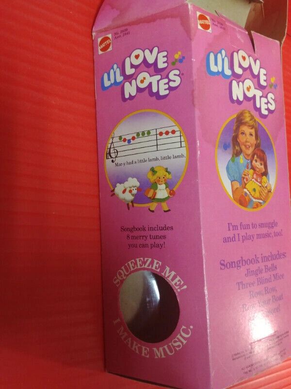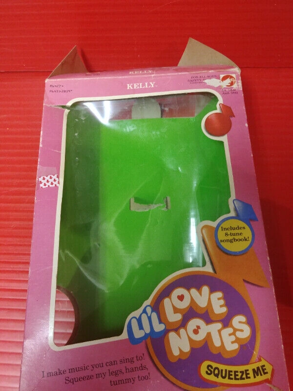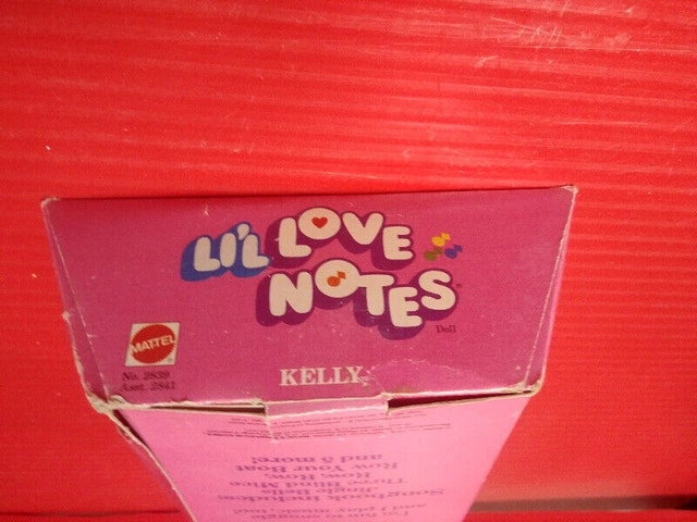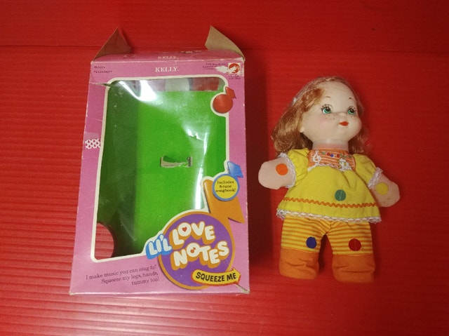 Up for sale we have this Rare Vintage Mattel Lil Love Notes Kelly Doll. Looks to be New in box. All notes on the doll are in working condition, make noise, play. Box is not perfect, creasing/crushing, one small tearing, wear, and some water stain BUT NOT ON THE DOLL etc, Mattel Toys. Considering Her age, She is still pretty nice. You squeeze Her hands, belly, legs and torso, and She make musical notes via a diaphragm inside. All work just as they should, she is 11 inches tall, a RARE FIND FROM A NON SMOKING/PET FREE ENVIRONMENT. Asking $120. Pickup on Old Richmond Road in Nepean