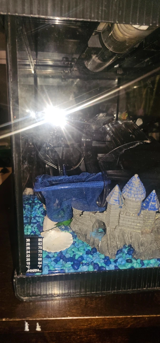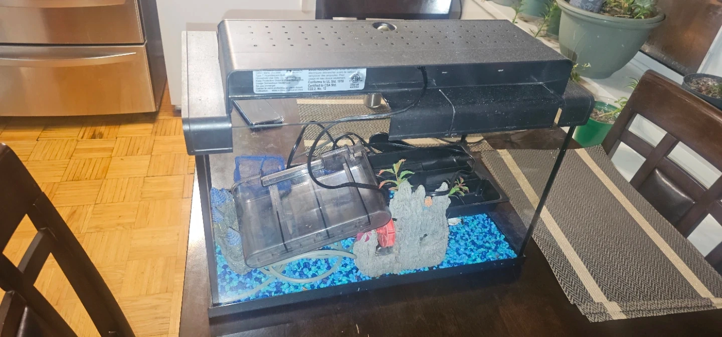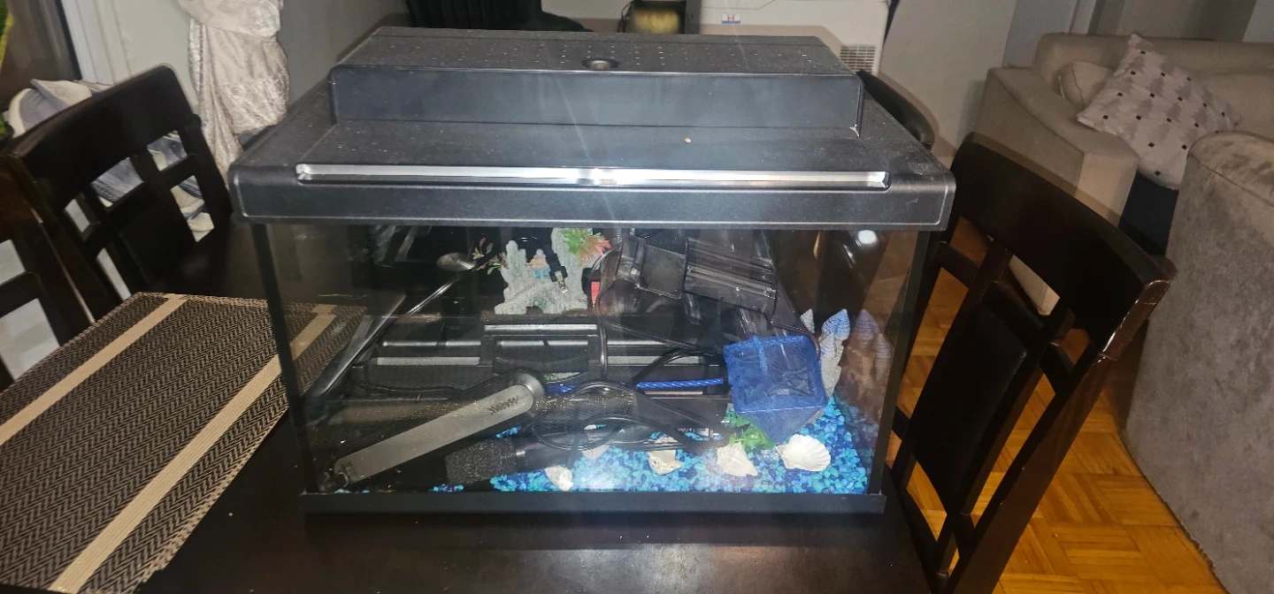 Selling a used fish tank that comes with accessories. It includes a filter, heater, net, and some decorations. Everything you need to get started!