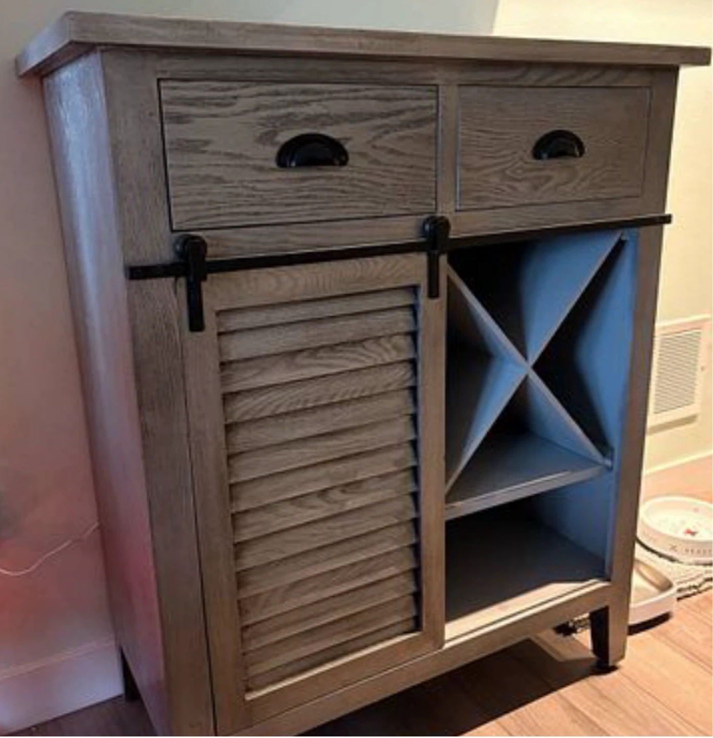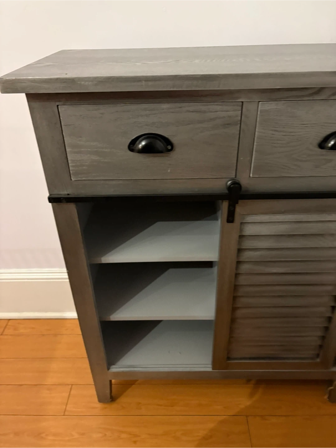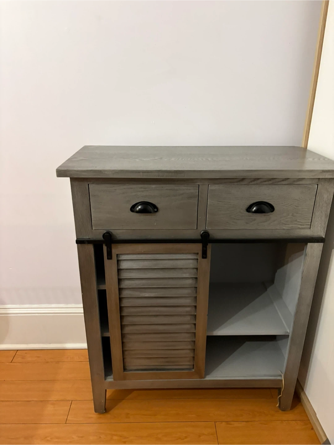 Selling a lovely grey wood-like wine cabinet. It has two drawers and a sliding door, perfect for extra storage in any room! It’s got a little dent in the corner (shown) but otherwise it’s great! Took the wine separator out but goes back in if needed.