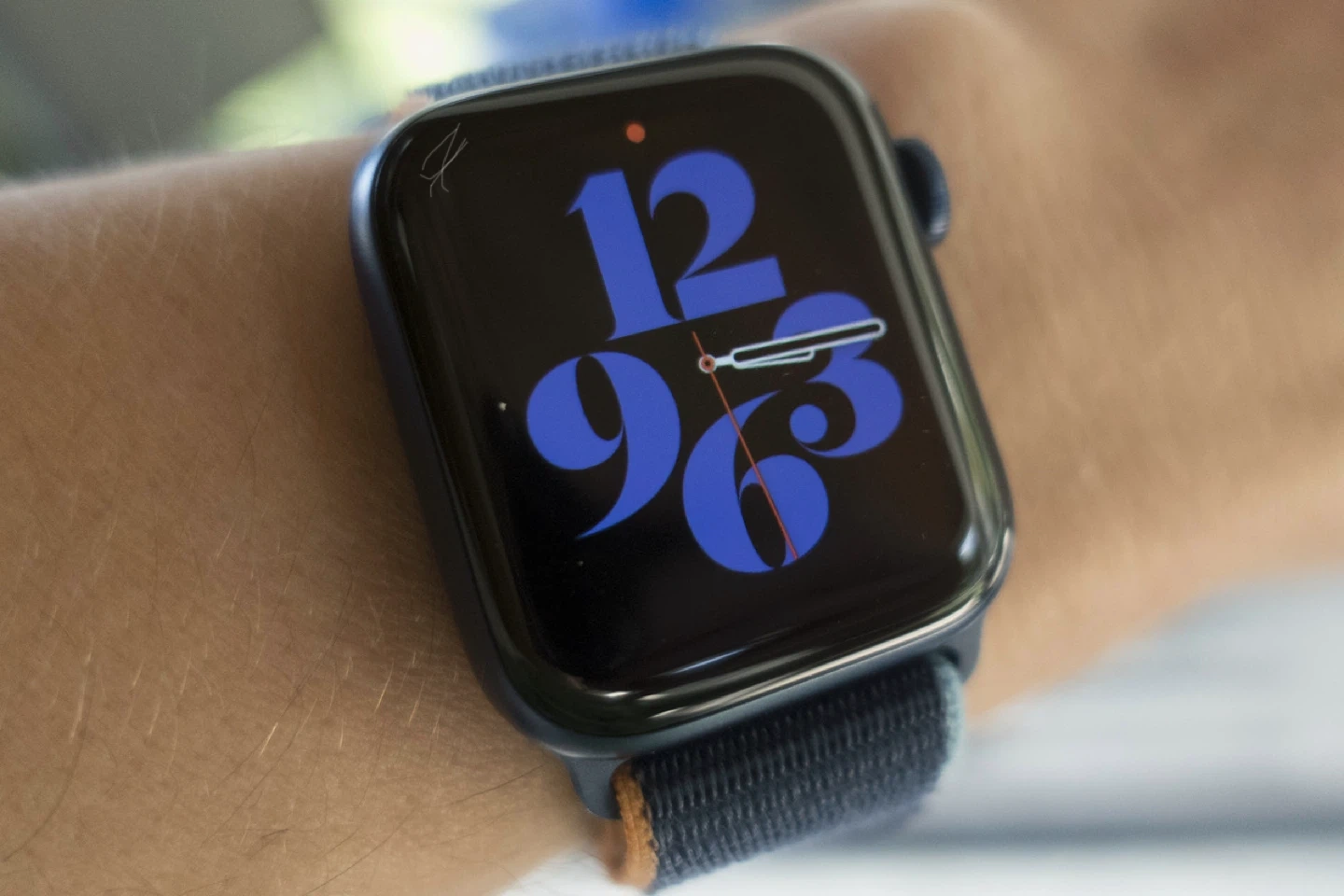 The watch shows some signs of wear. There is a small scratch on the top left of the screen.