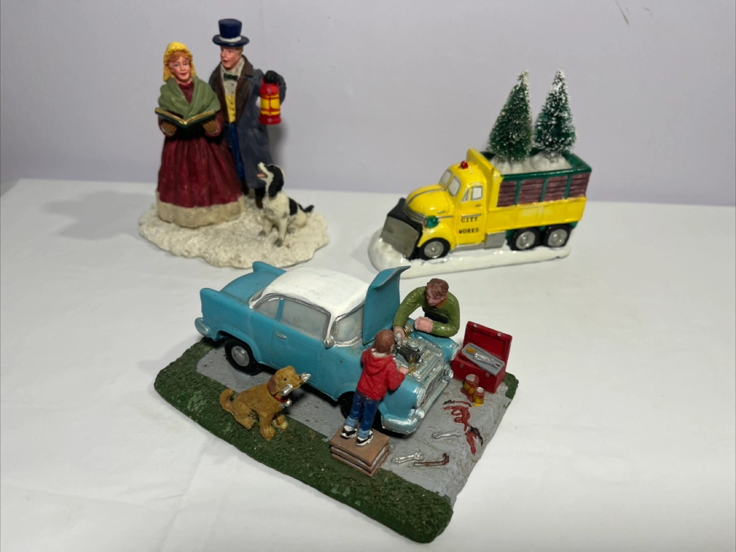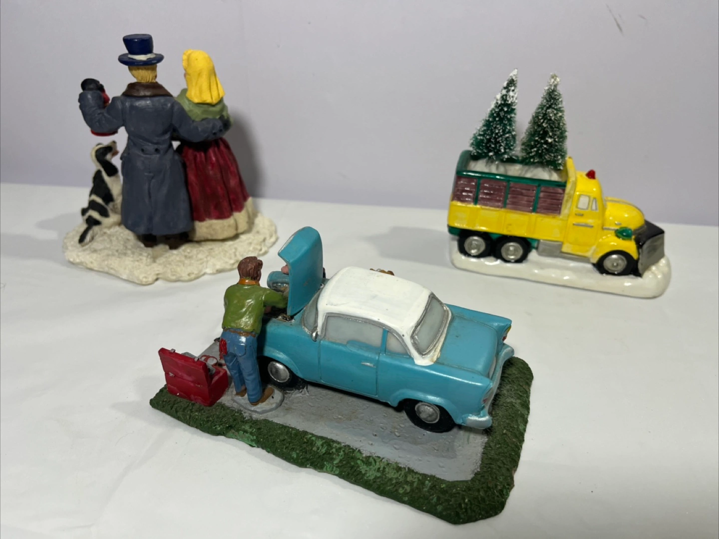 Selling a set of Christmas village figurines. These charming pieces would be a great addition to any holiday display! They depict various scenes, including a couple with a dog, a truck with Christmas trees, and a mechanic working on a car.