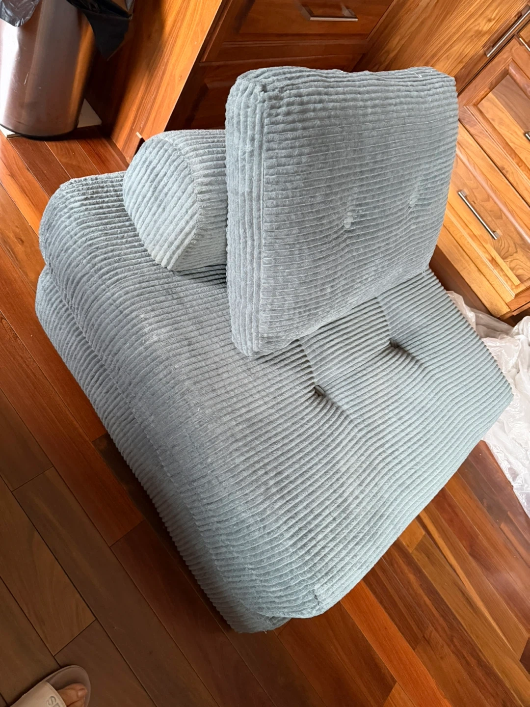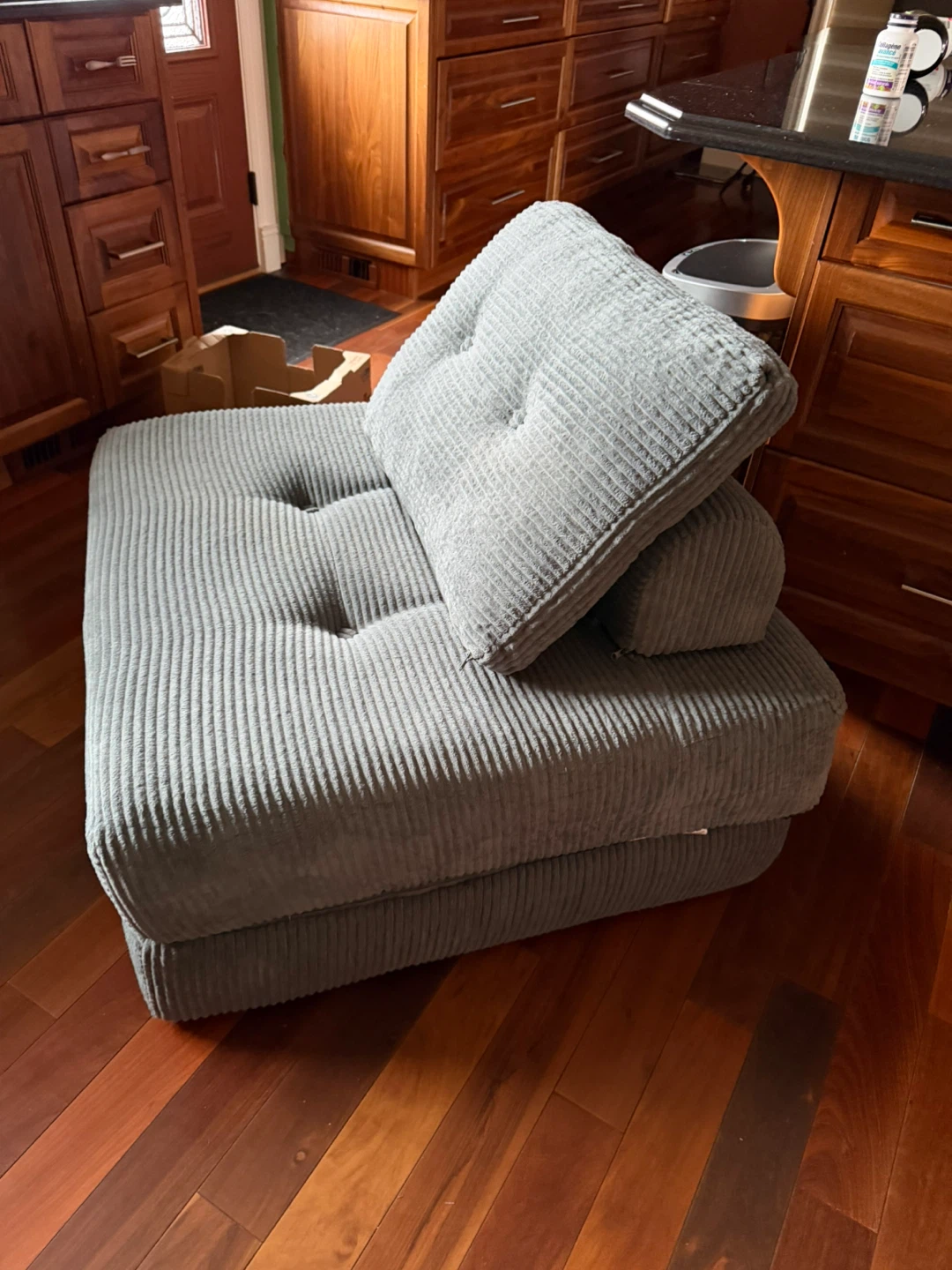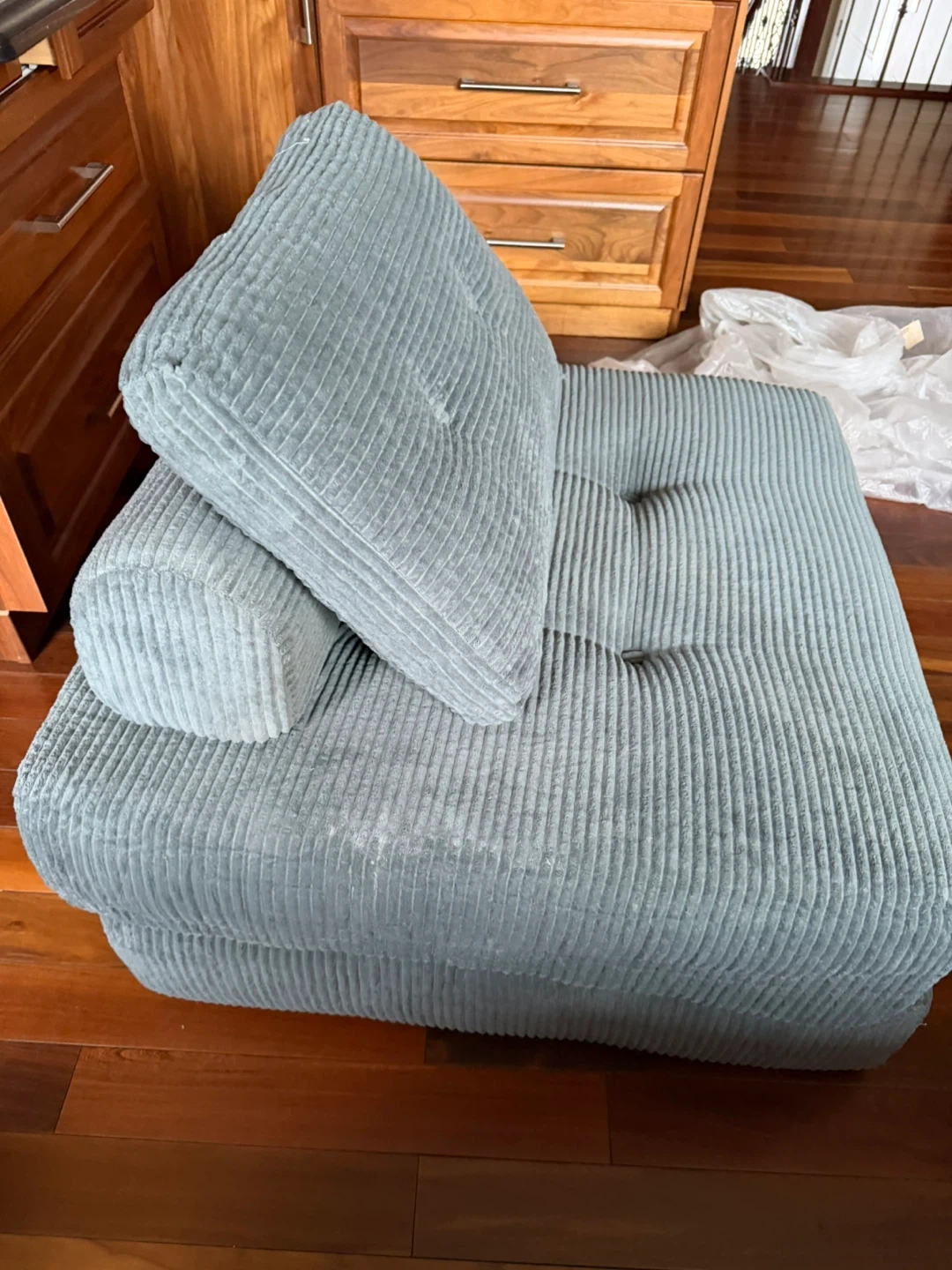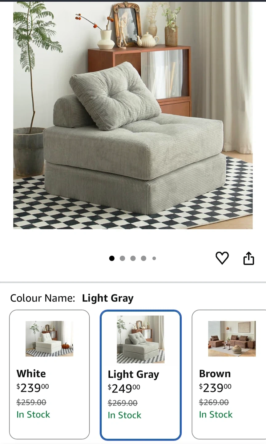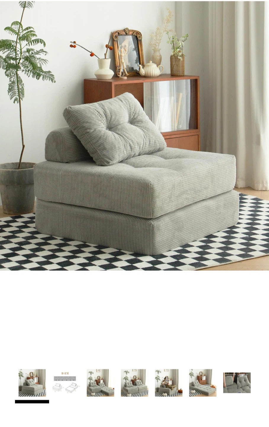 Here's a comfy light gray corduroy convertible sofa bed! It's perfect for small spaces and can be used as a chair or a bed. Originally bought for $249