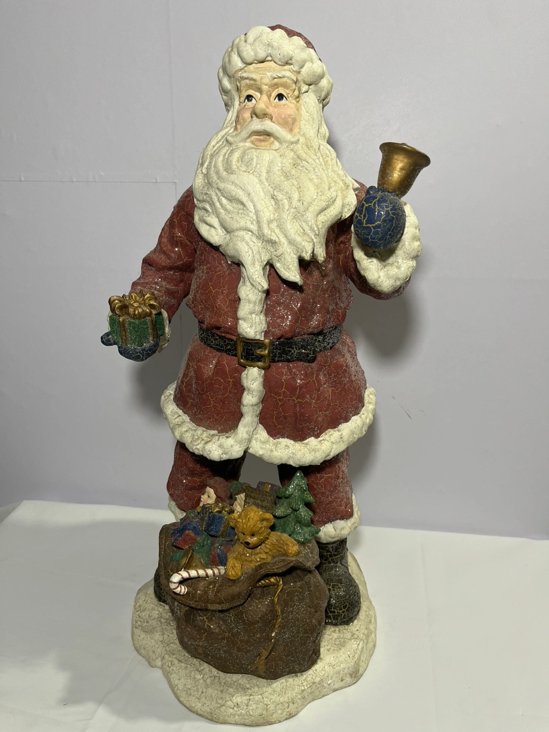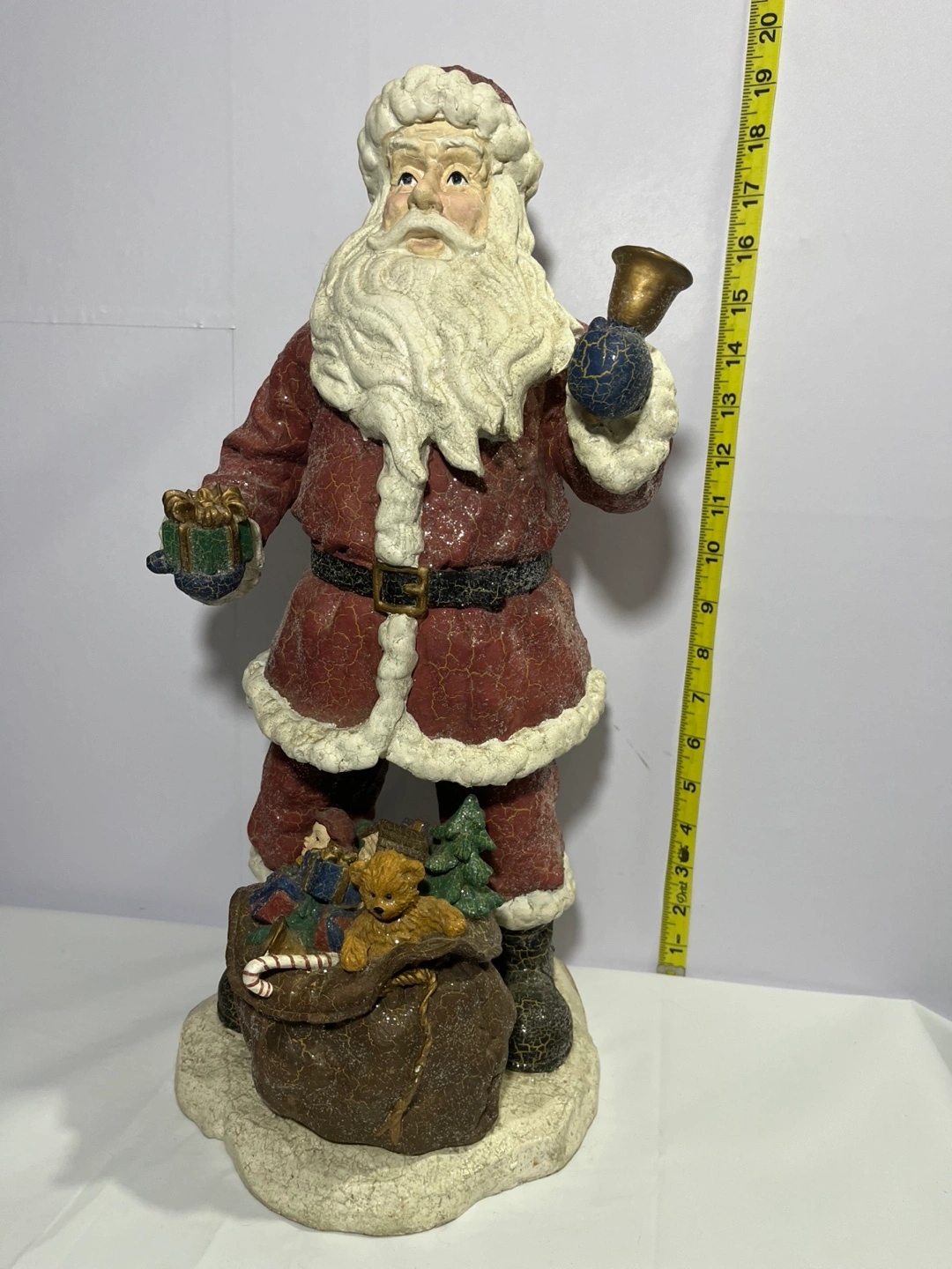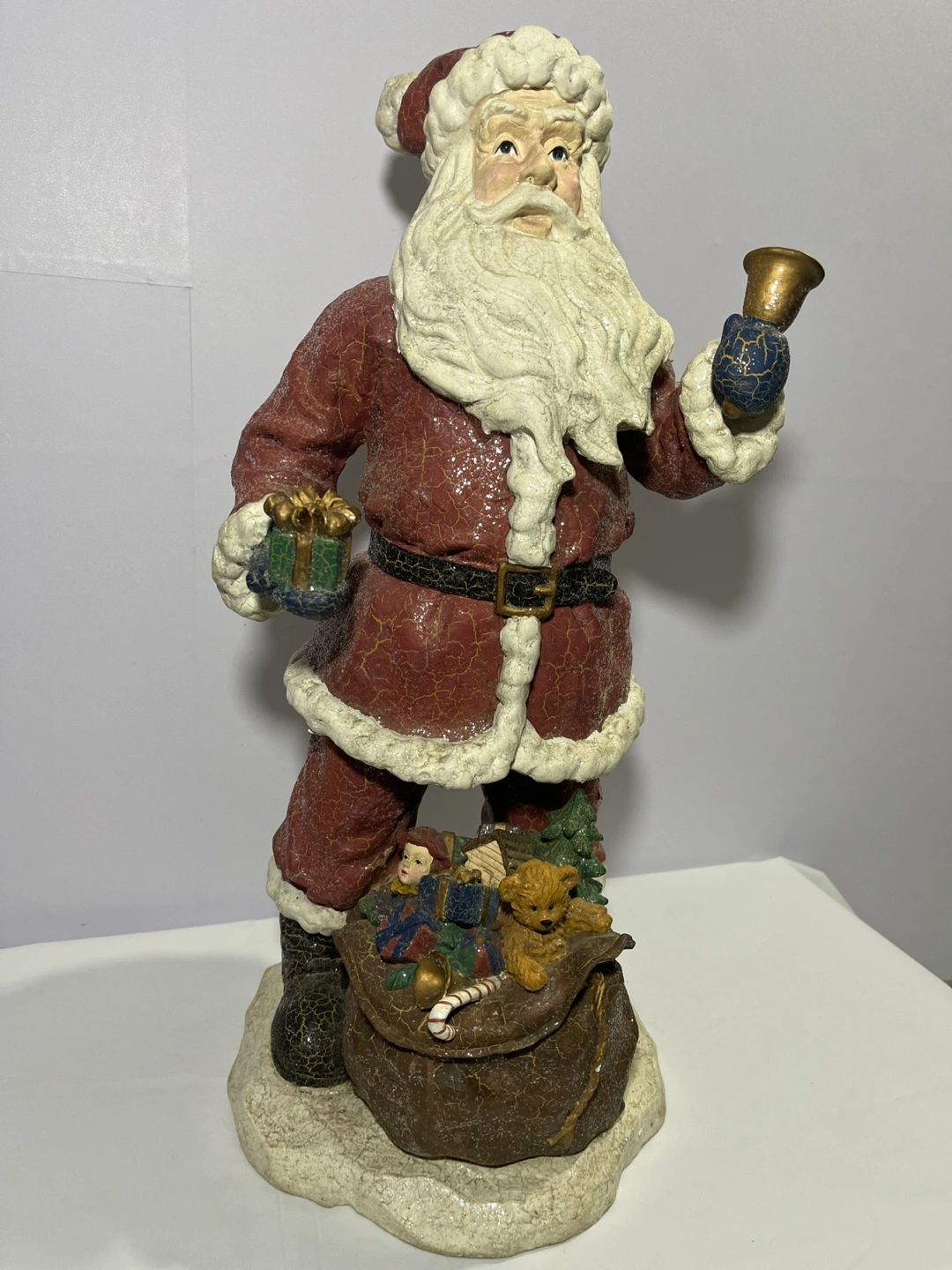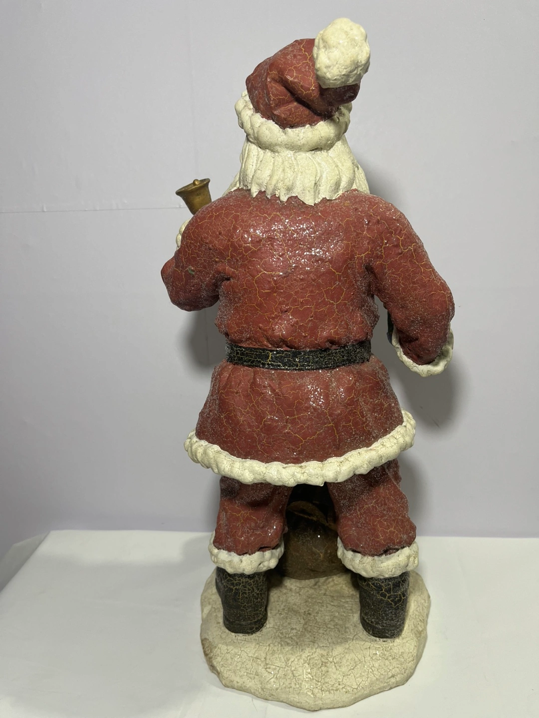 Here's a charming Santa Claus figurine holding a bell! It's in great condition and ready to bring some holiday cheer to your home.