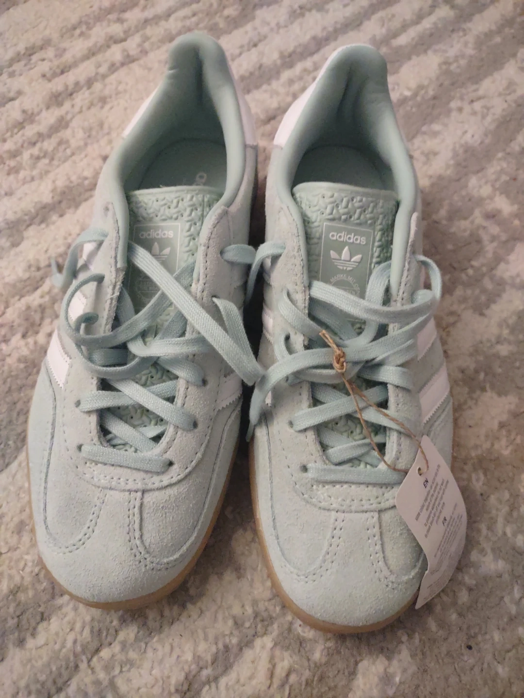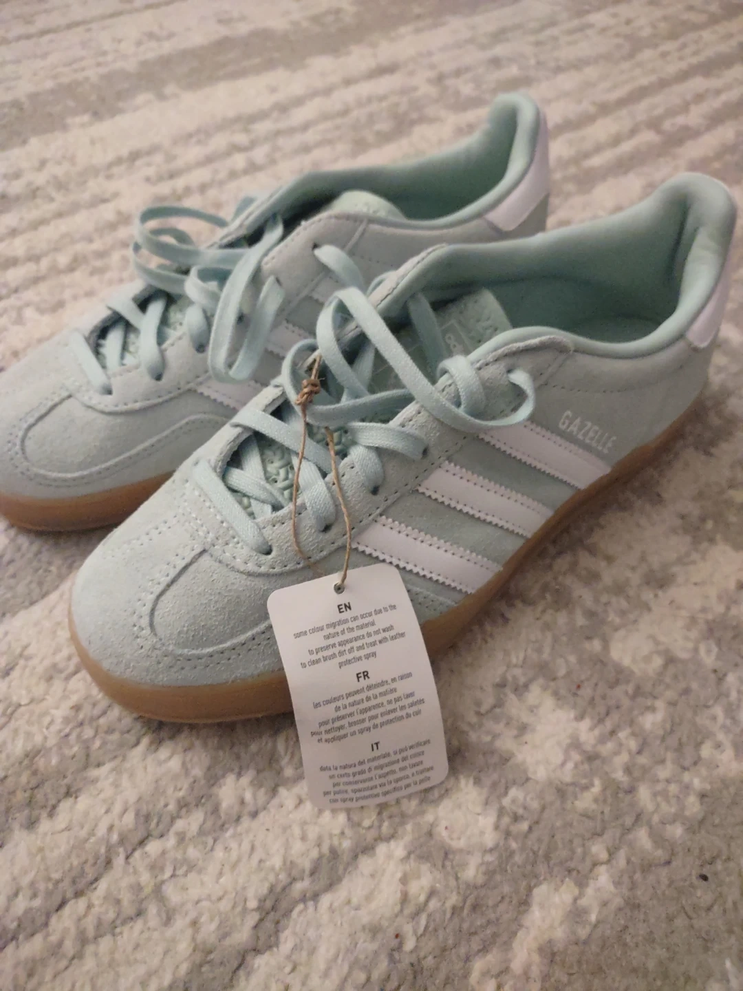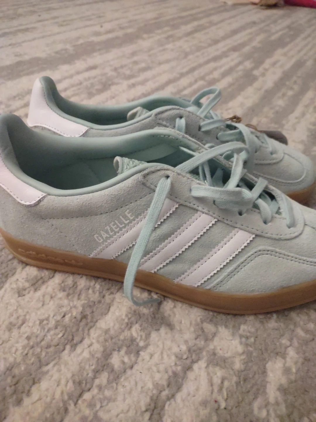 Selling a pair of Adidas Gazelle shoes in a lovely light green colour! They are a women's size 7 US. These classic sneakers feature the iconic three stripes and a comfortable fit. Perfect for everyday wear! Brand new with tags, never worn at all!