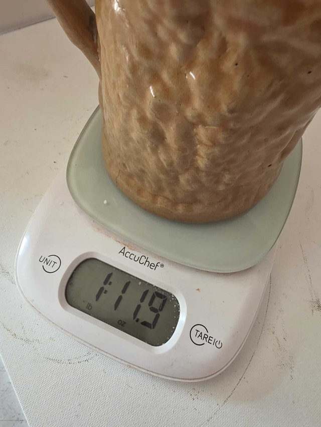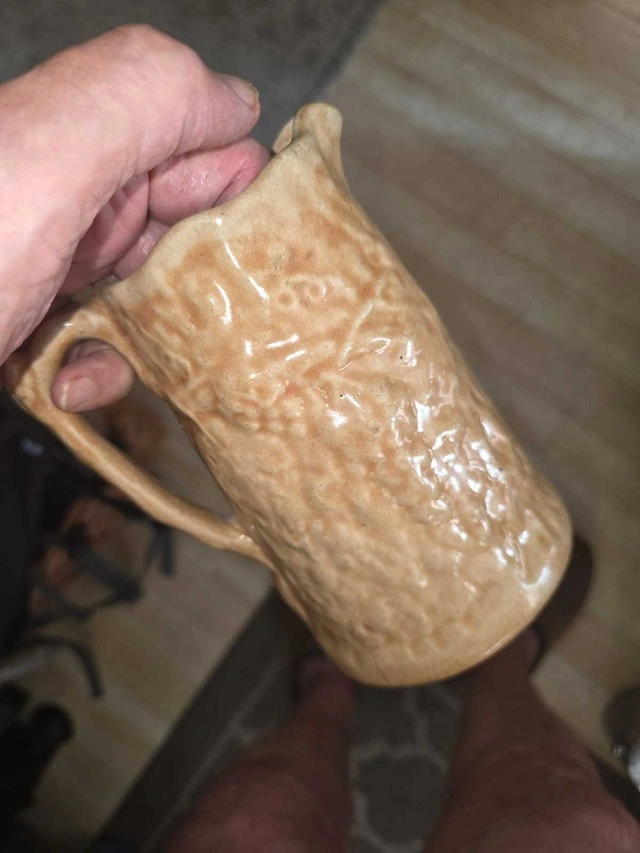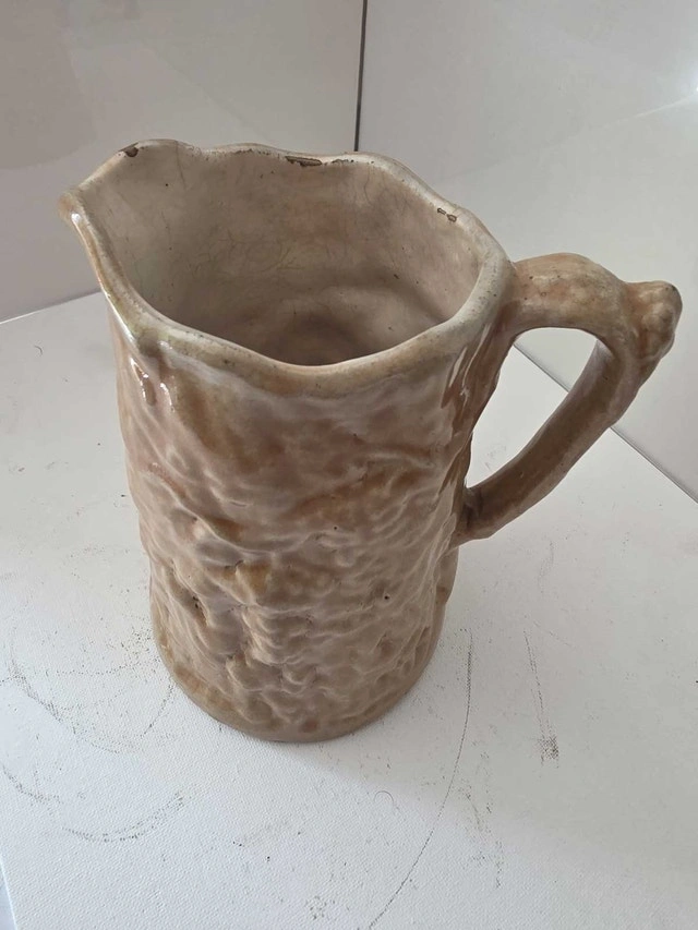 Click on the photographs to get a better view. This is a used, decorative antique ceramic pitcher. The tan pitcher features grape vine textured detailing, and a classic spout and handle. This pitcher adds rustic charm to any table setting or decor. I am still looking for the actual manufacturer and expect this could be a very valuable little ceramic. I have seen similar ceramic pictures priced very close to $200 hundred dollars. Minor chip on lip as seen in photo. No markings that I can see. If you know the precise pattern and manufacturer let me know please. Measurements: - Weight: 1 lb 11.9 oz - 7 inches This little pitcher is waiting to make its debut in your home! If the ad is still up, yes, it's still available!