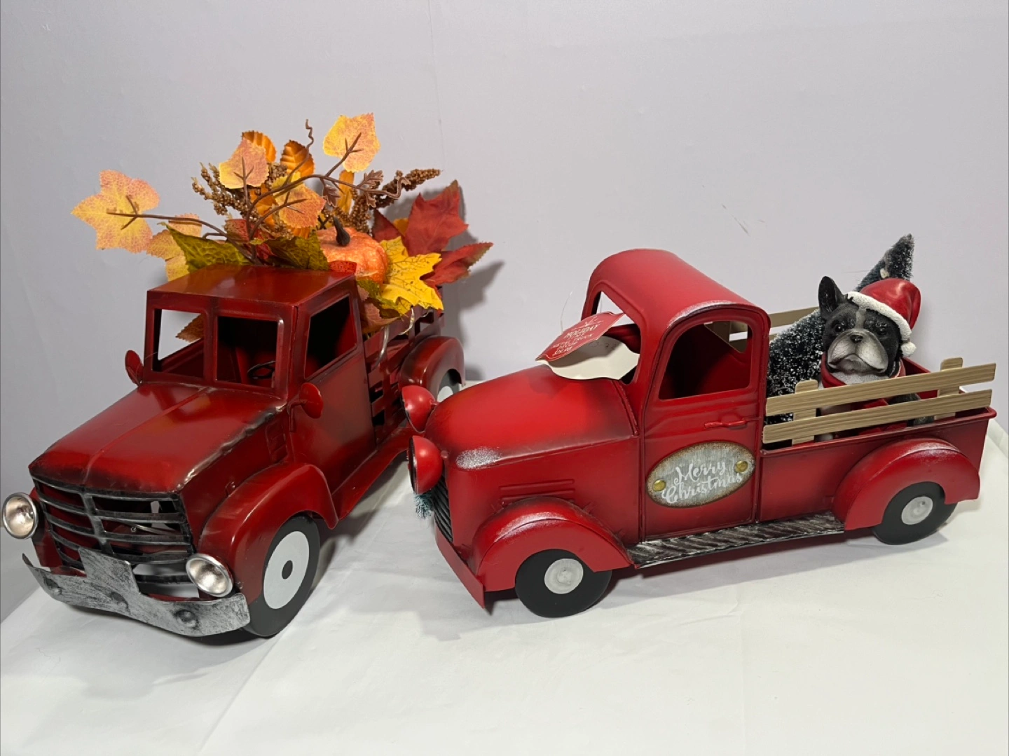 Selling a set of two charming red metal truck decorations! They are perfect for adding a rustic touch to your home decor. One truck is filled with autumn leaves and a pumpkin, while the other features a cute dog wearing a Santa hat and a Christmas tree. These are sure to bring a festive feel to any room