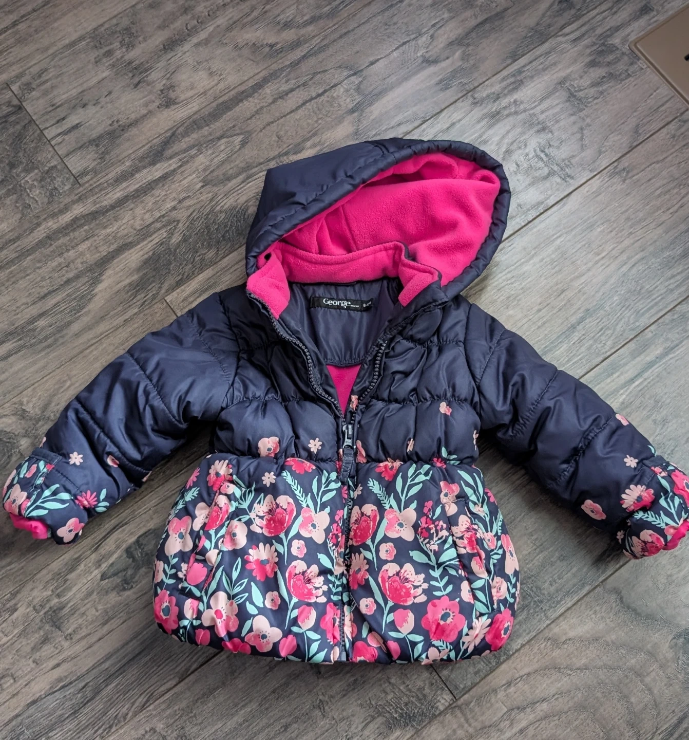 Here's a super cute puffer jacket for your little one! It's a George brand jacket, sized 6-12 months. The jacket is navy blue with a pink fleece lining and a floral pattern on the bottom. Perfect for keeping baby warm and stylish!