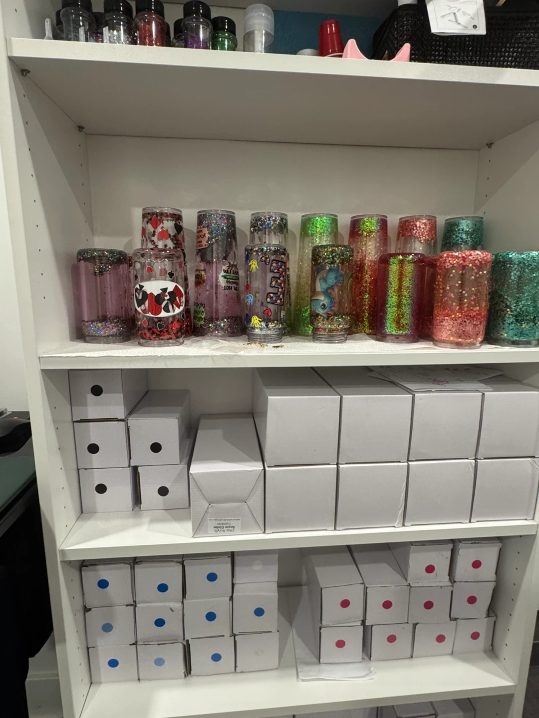Selling my snow globe business- shelf includes 24+ new tumblers in boxes, 14 additional tumblers already made , 100+ tumblers decals, 80+ assorted glitters, materials and tools, solutions and my personal step by step guide on how to make the cups from start to finish