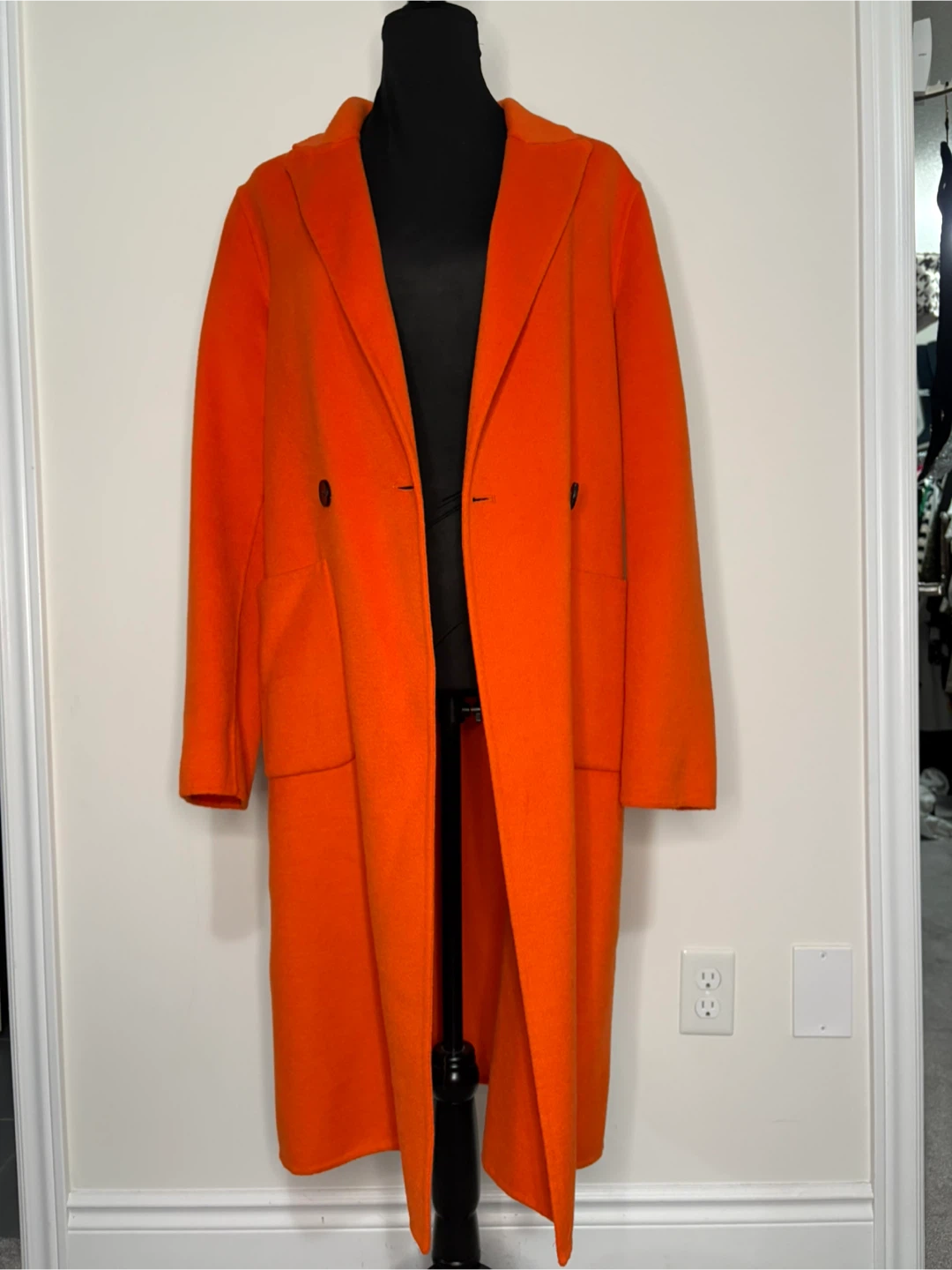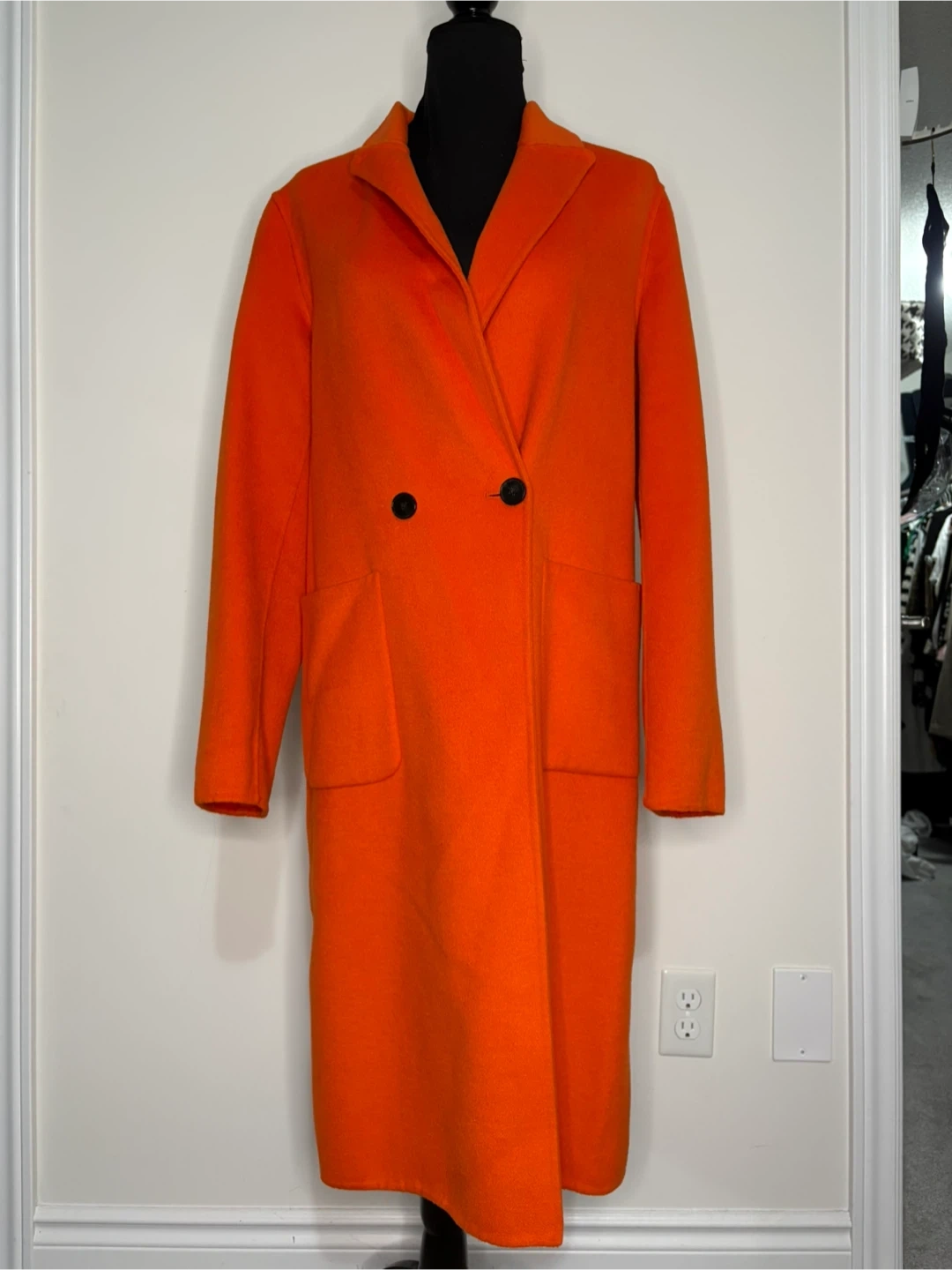 Here's a Zara coat in a vibrant orange colour! It's a wool blend and in size M. Originally bought for $100 tax in
