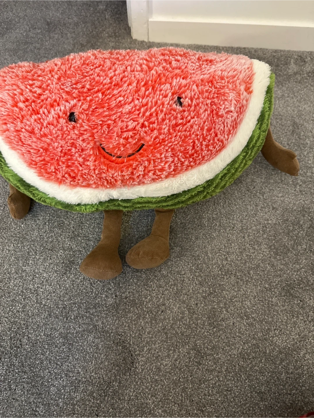 Selling a cute Jellycat watermelon plush! It's in great condition and ready for a new home. This adorable plush toy is perfect for kids or anyone who loves unique and cuddly items. Its soft texture makes it perfect for snuggling!