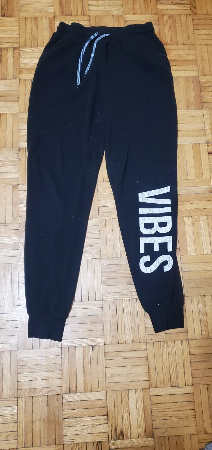 Selling a pair of comfy black joggers! They have a drawstring waist and the word 'Vibes' printed on the lower leg. Perfect for lounging or running errands
