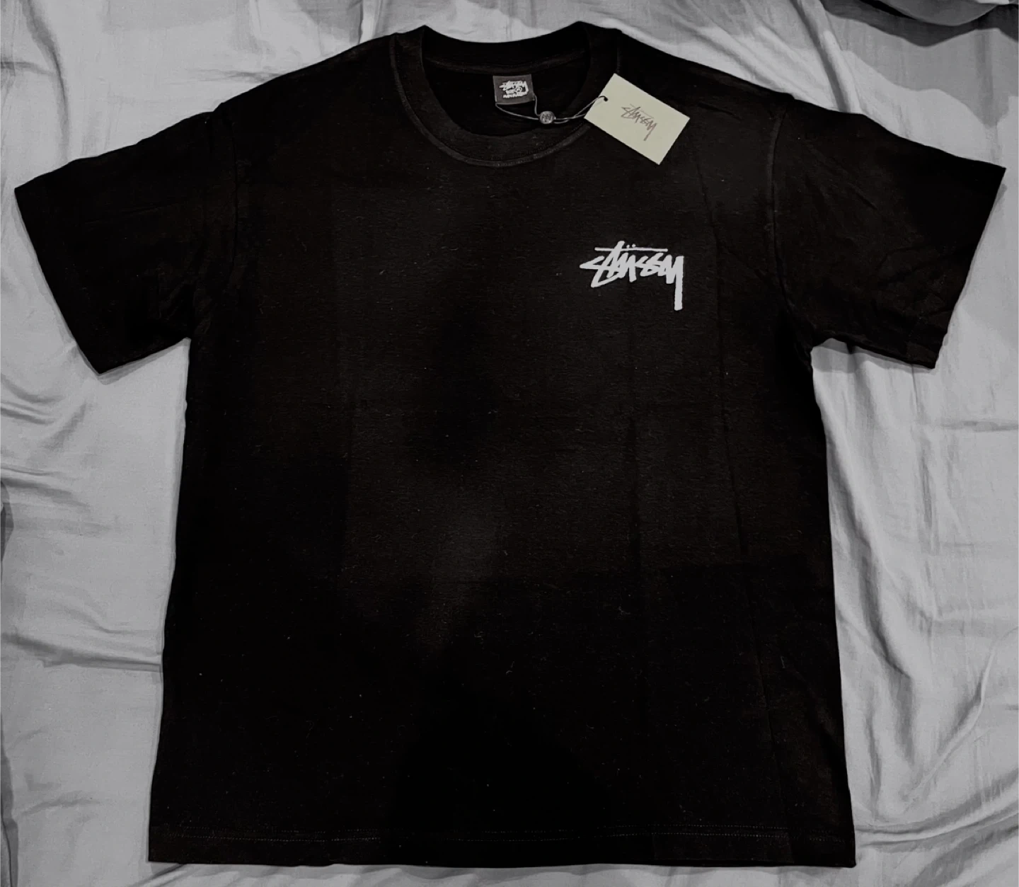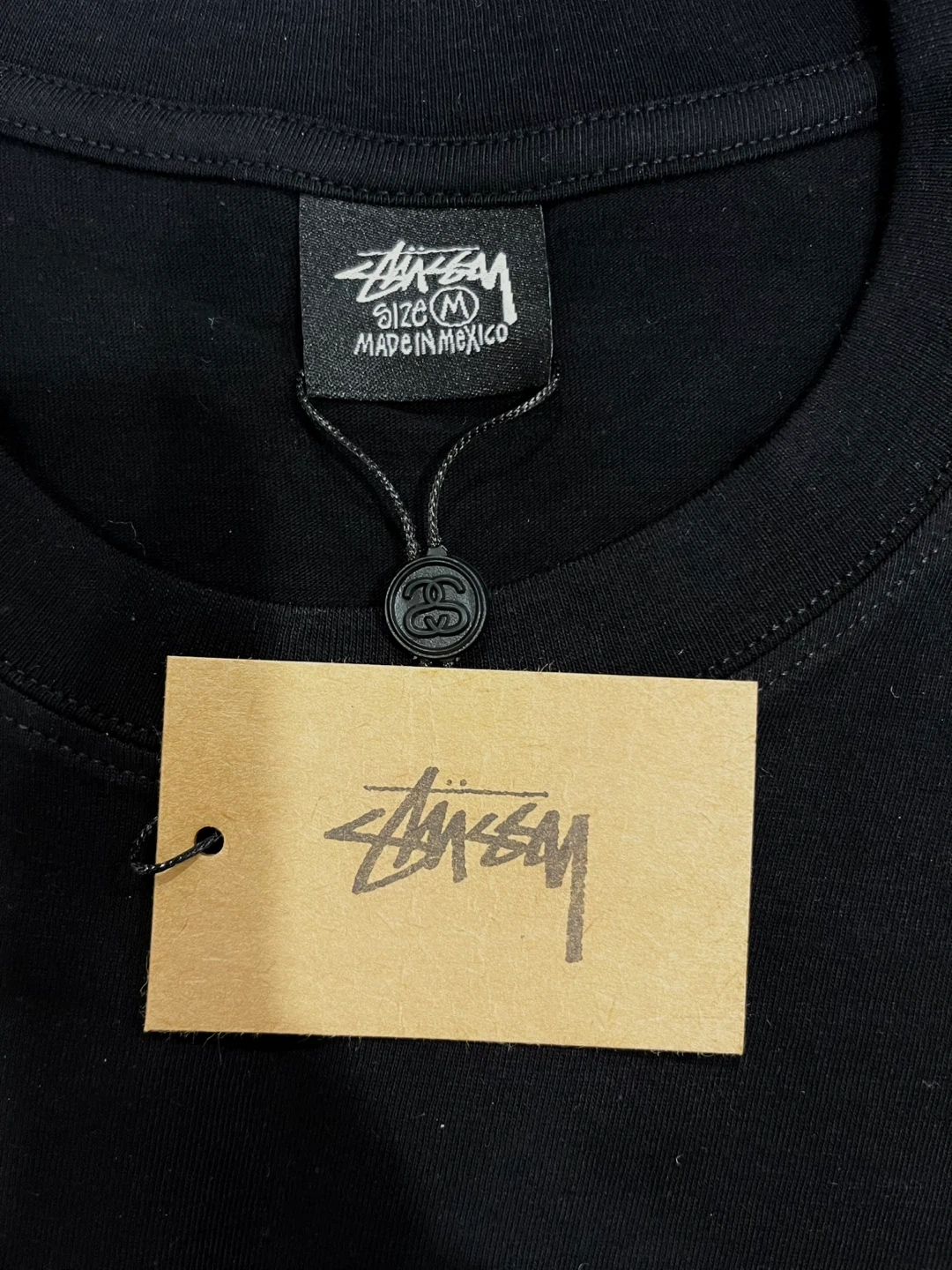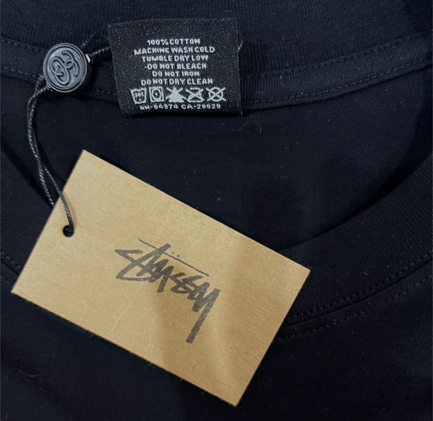 Proof of authenticity: cardboard brand tag and neck tag printed with Stussy identification codes (RN and CA).
