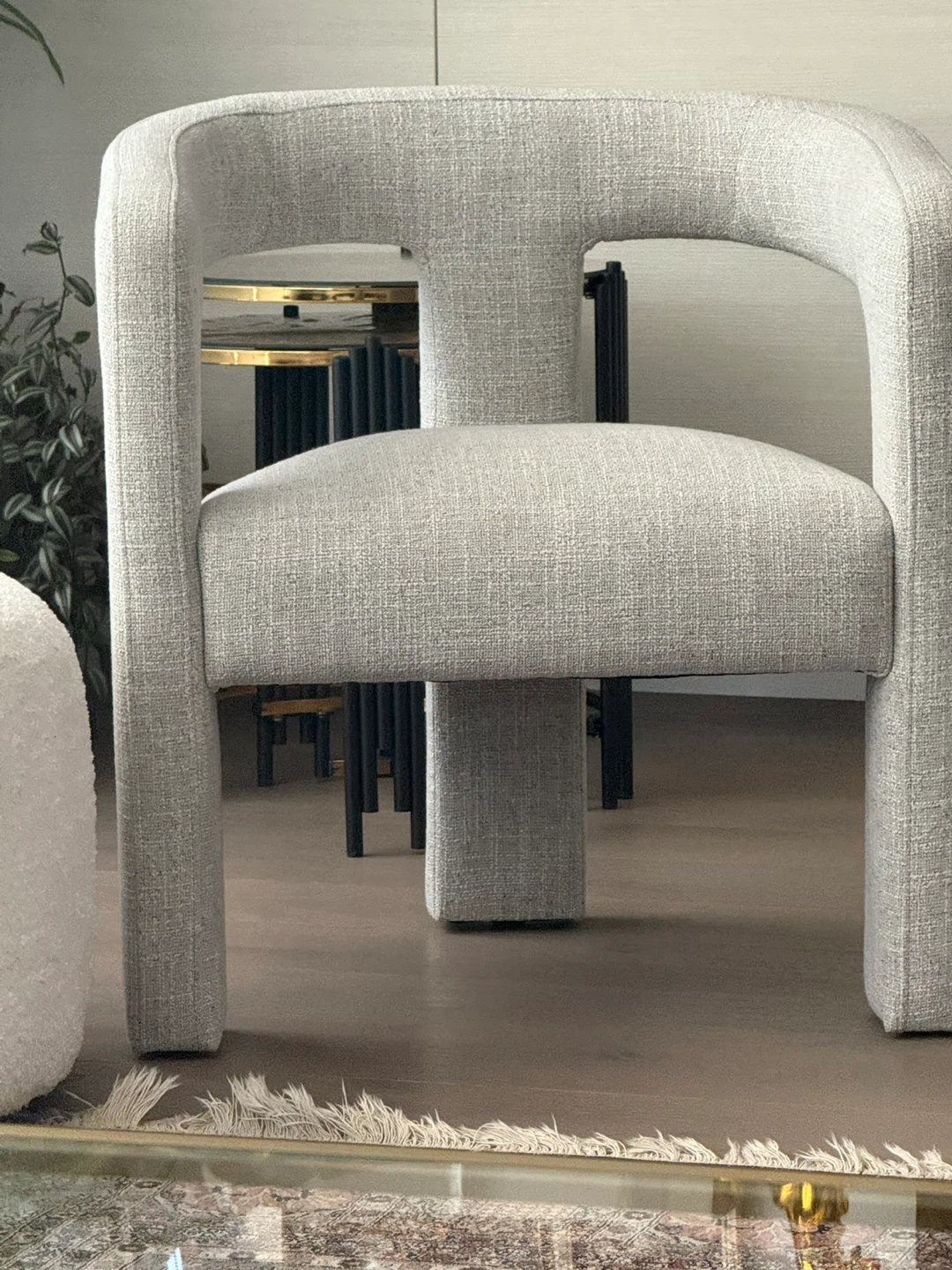 Selling a stylish grey upholstered accent chair! It's in great shape and would look lovely in any living space. The fabric is a nice neutral grey tone that can match any decor. It's a comfortable and sturdy chair!