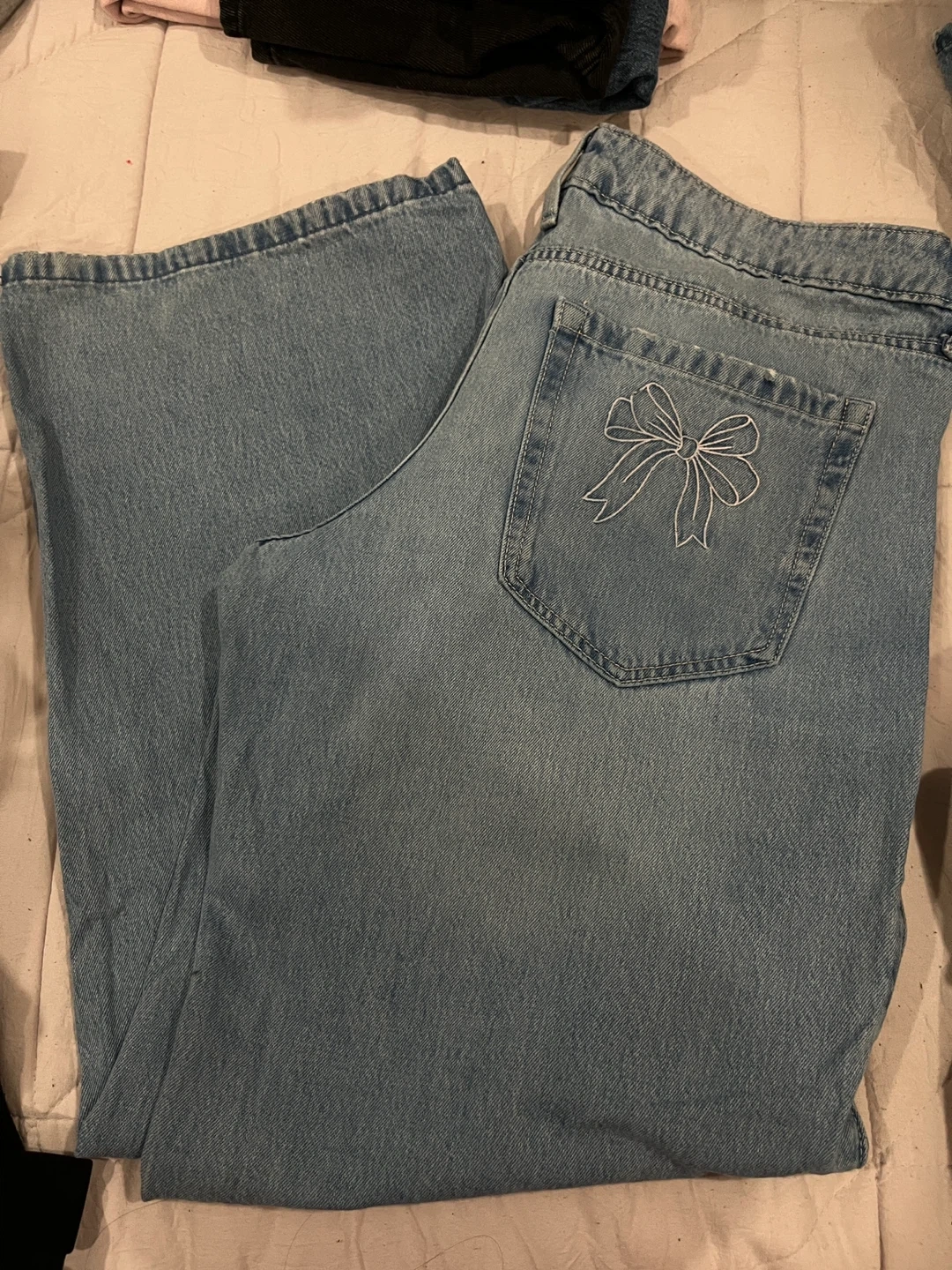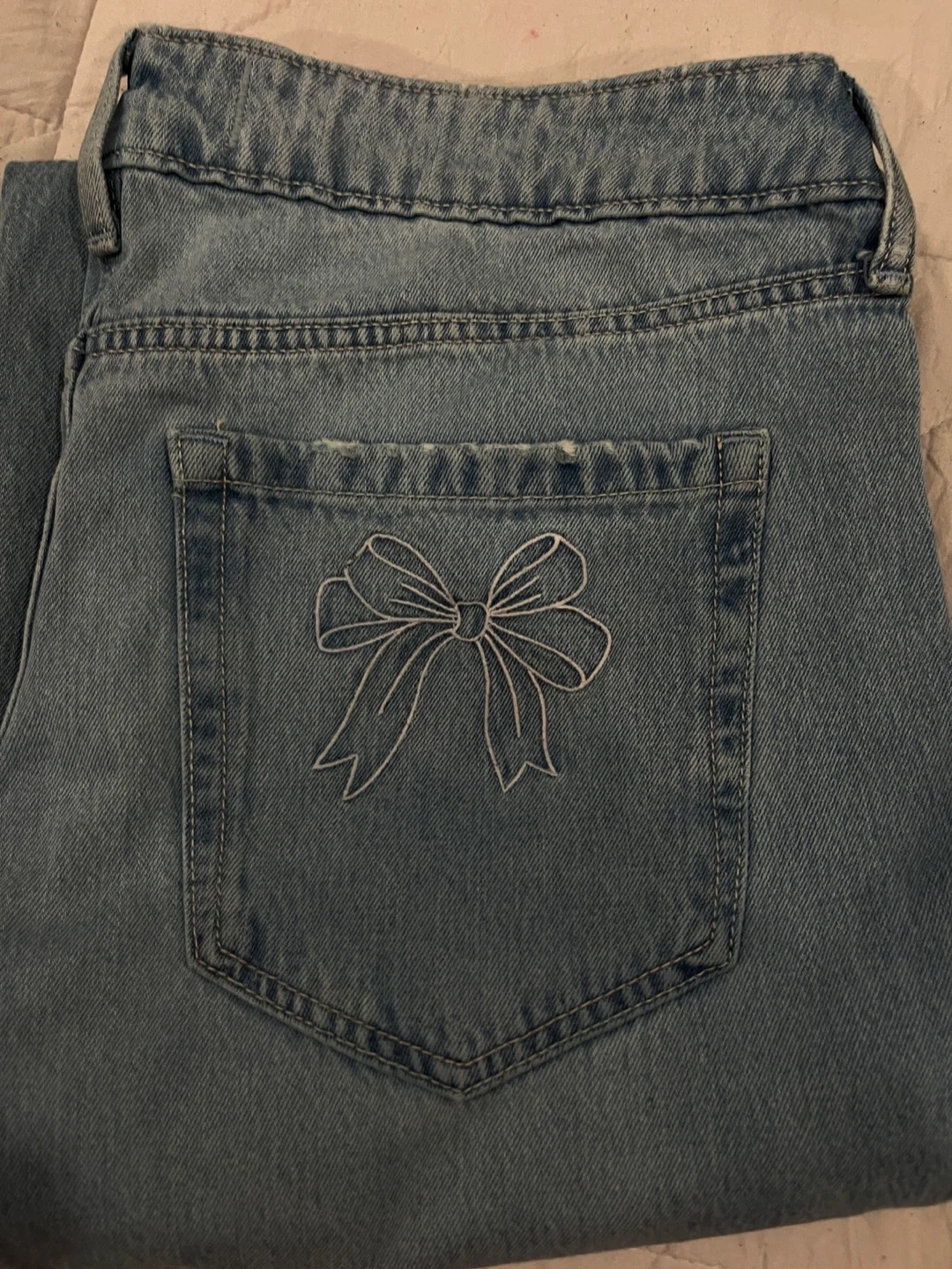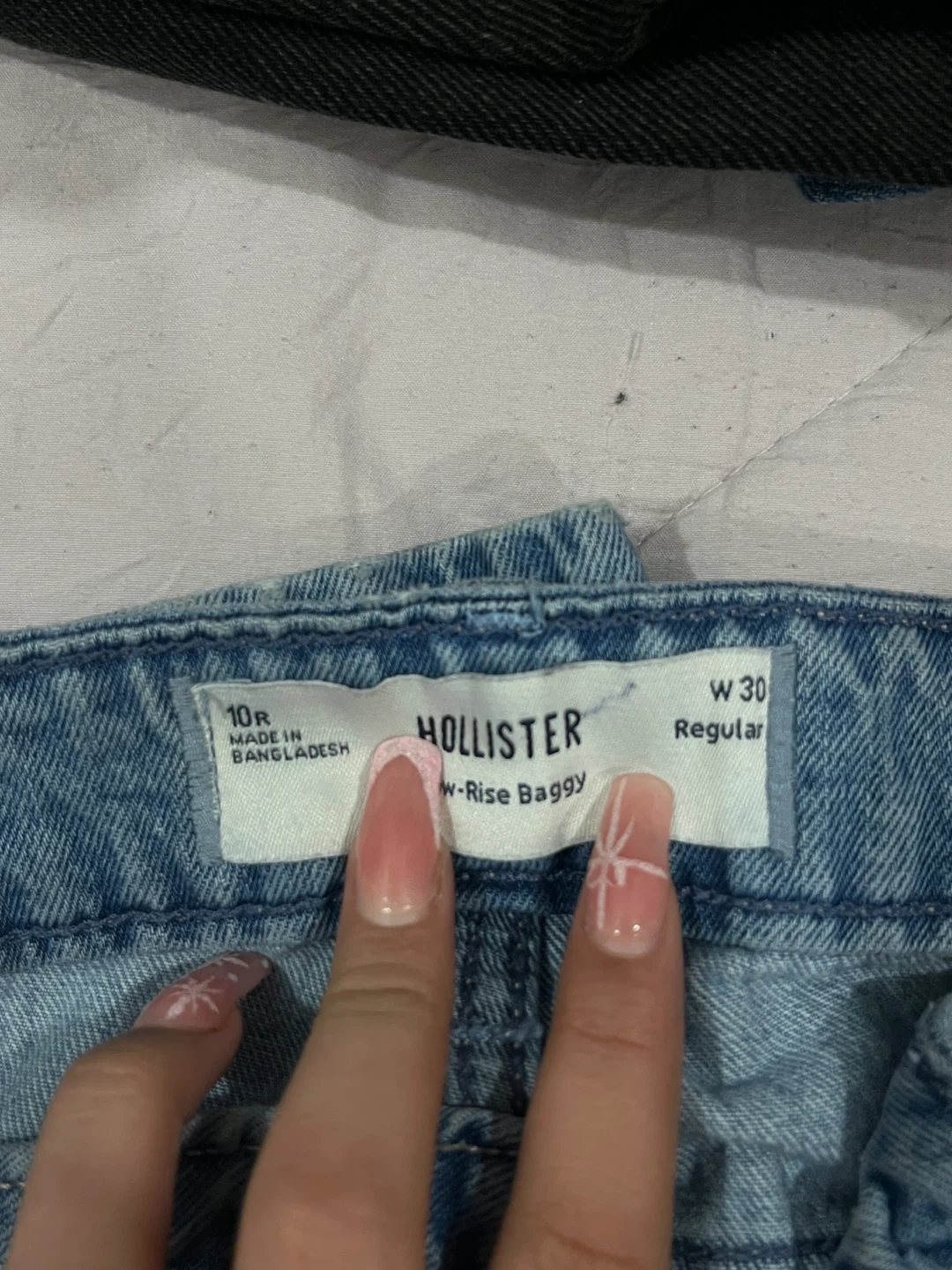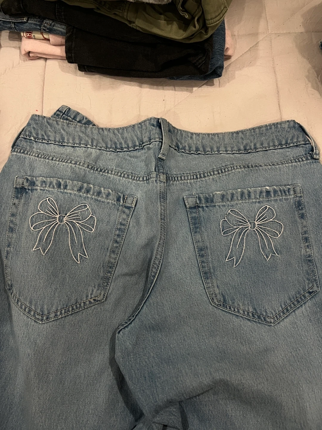 Selling a pair of Hollister W-Rise Baggy jeans in size 30. They feature a cute bow design on the back pockets. These jeans are in great condition and ready for a new home!