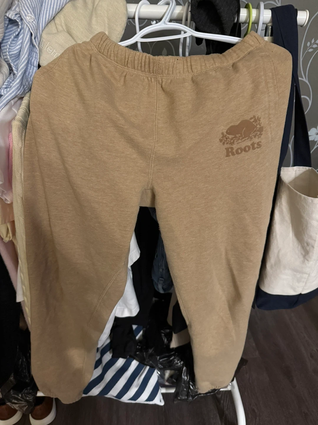Selling a pair of Roots Original Sweatpants in a tan colour! These are super comfy and perfect for lounging around the house or running errands. They feature the classic Roots logo and are made from a soft, durable fabric.