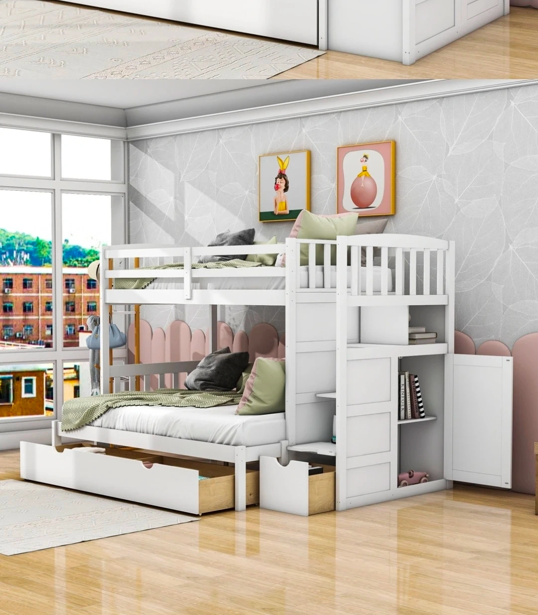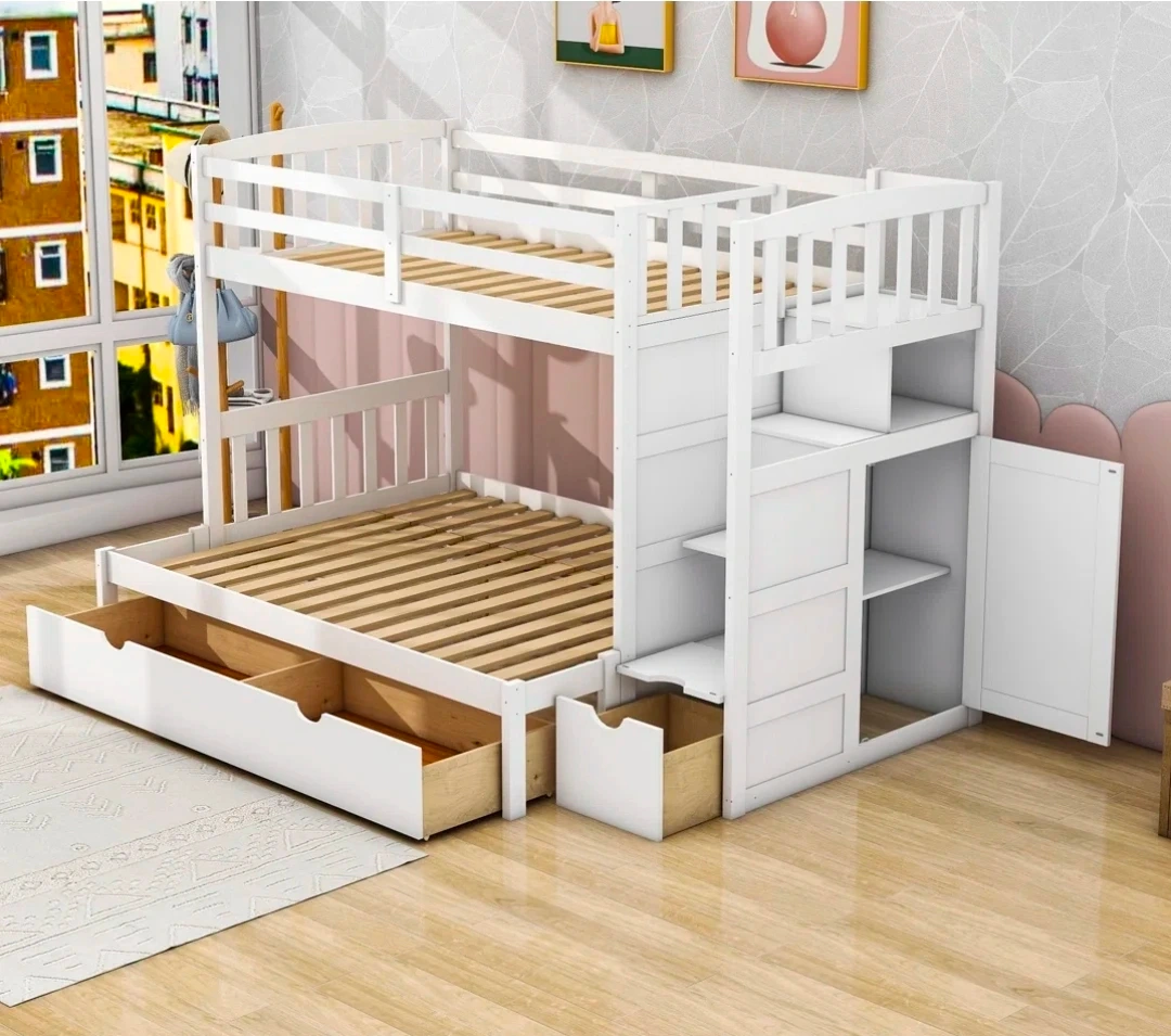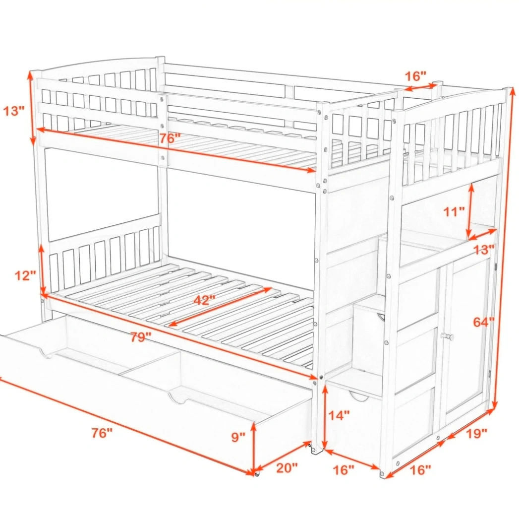 Looking to sell this bunk bed. It has a clean white finish and includes built-in storage with drawers and shelves. The dimensions are approximately 76" x 42" for the bed frames, offering a comfortable sleeping space. The overall structure is sturdy and well-maintained, perfect for a kids' room or guest room!