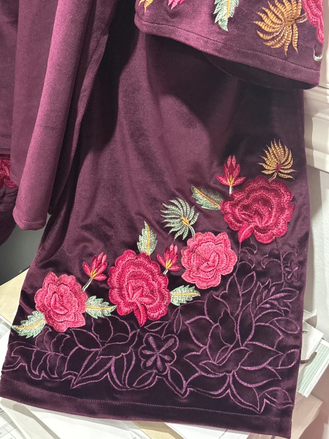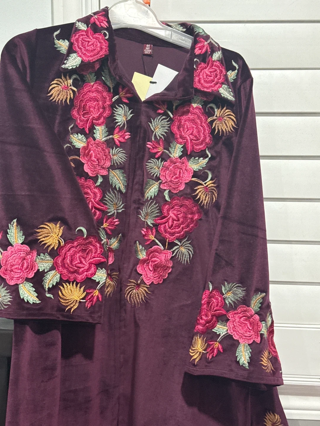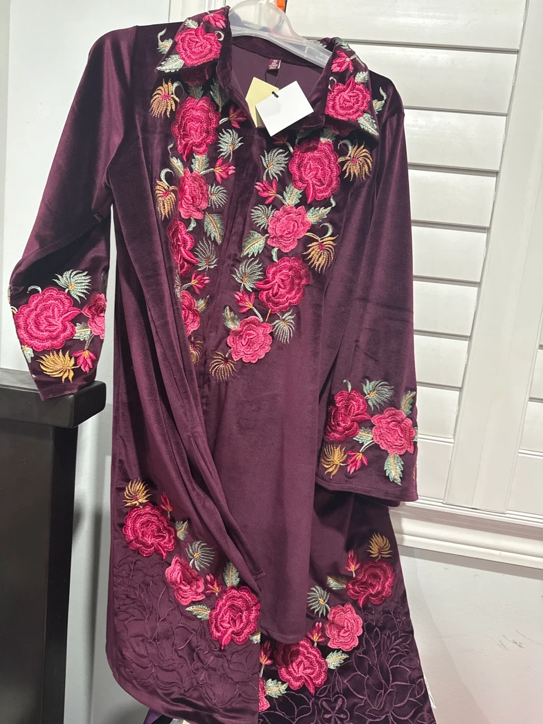 Selling a beautiful velvet dress with floral embroidery. It's a gorgeous piece that would be perfect for a special occasion or just to add some elegance to your wardrobe