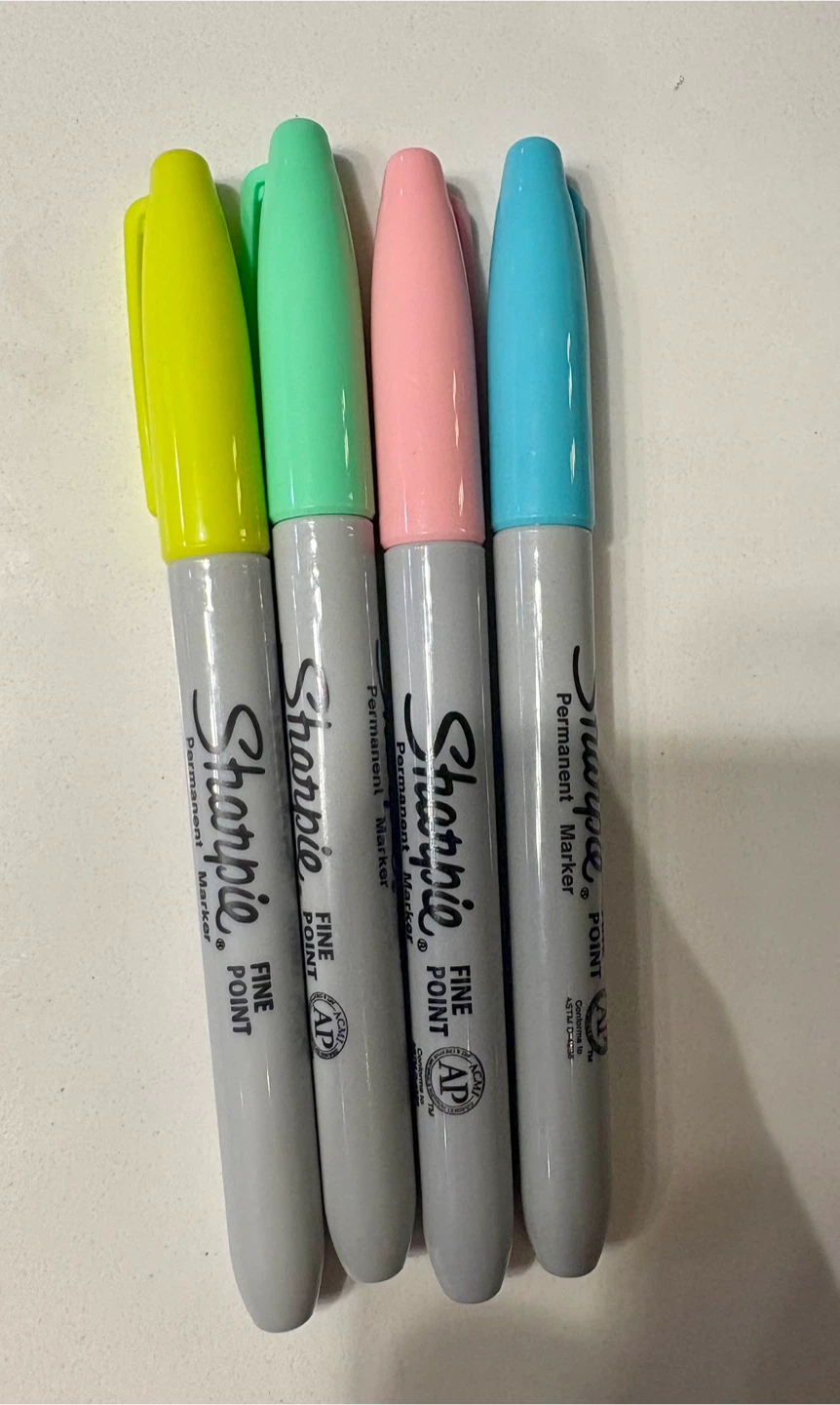 Selling new Sharpie permanent markers with a fine point. Never used. The set includes yellow, mint, pink, and light blue markers. Beautiful pastel rare colours. They're great for all sorts of projects!
