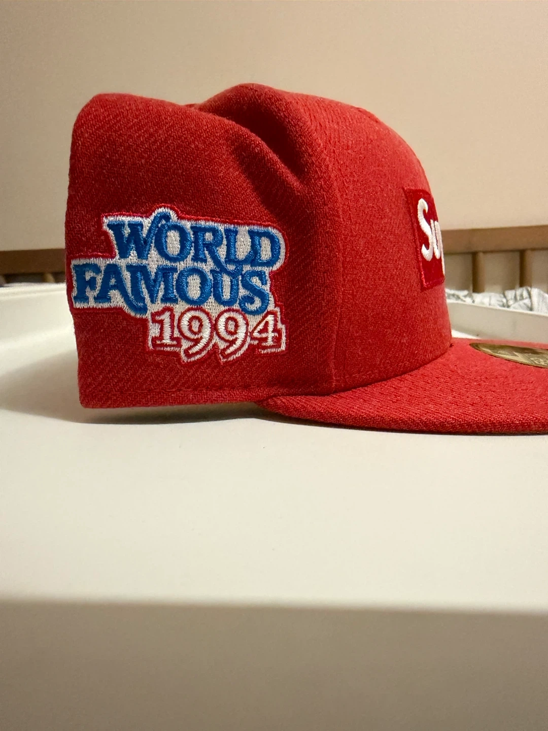 Selling a Supreme New Era cap in red! It's a size 7 1/2 (59.6cm). The hat has a 'World Famous 1994' design on the side. It's in great condition!