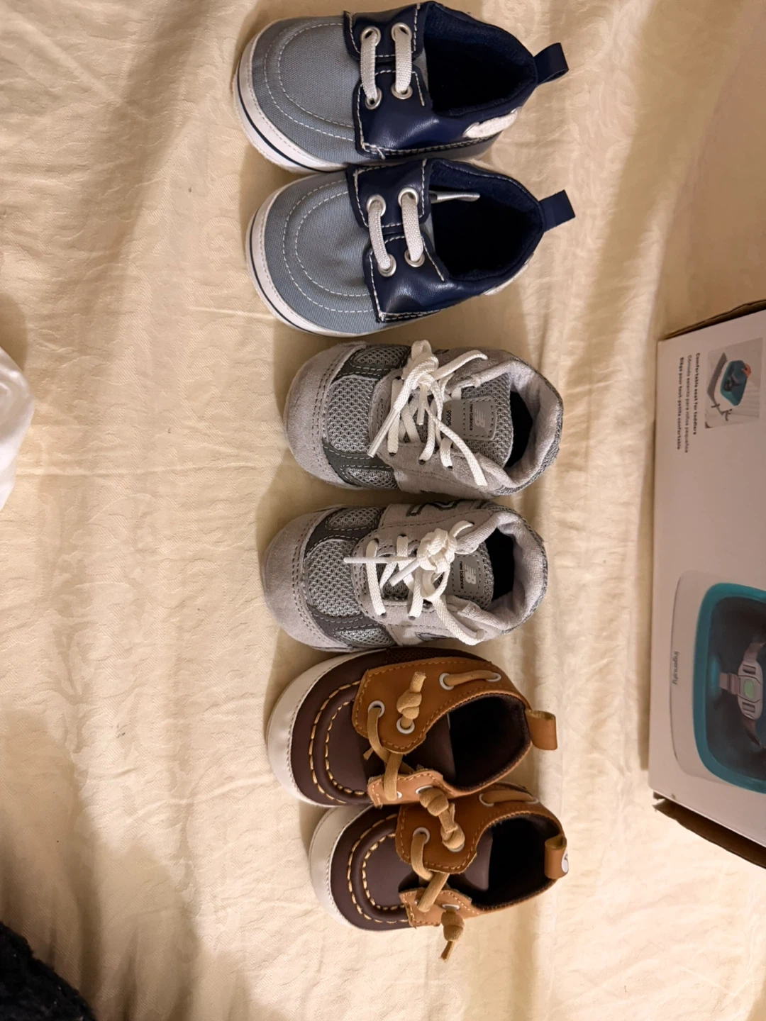 I have a bundle of baby shoes available! There are three pairs of shoes in total. One pair is New Balance. They are all in great condition and ready for a new little one!