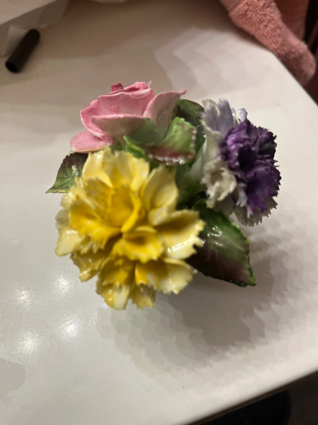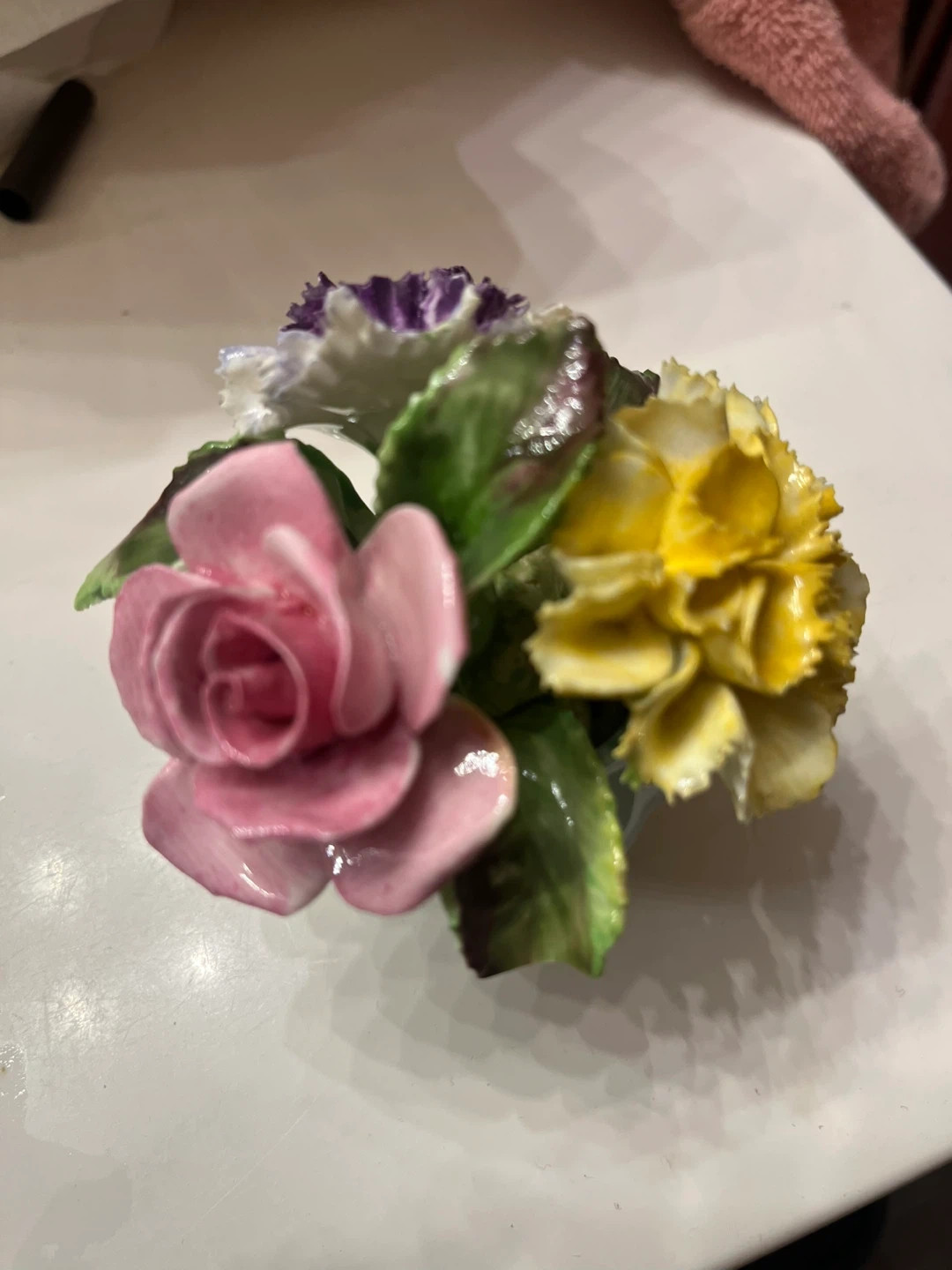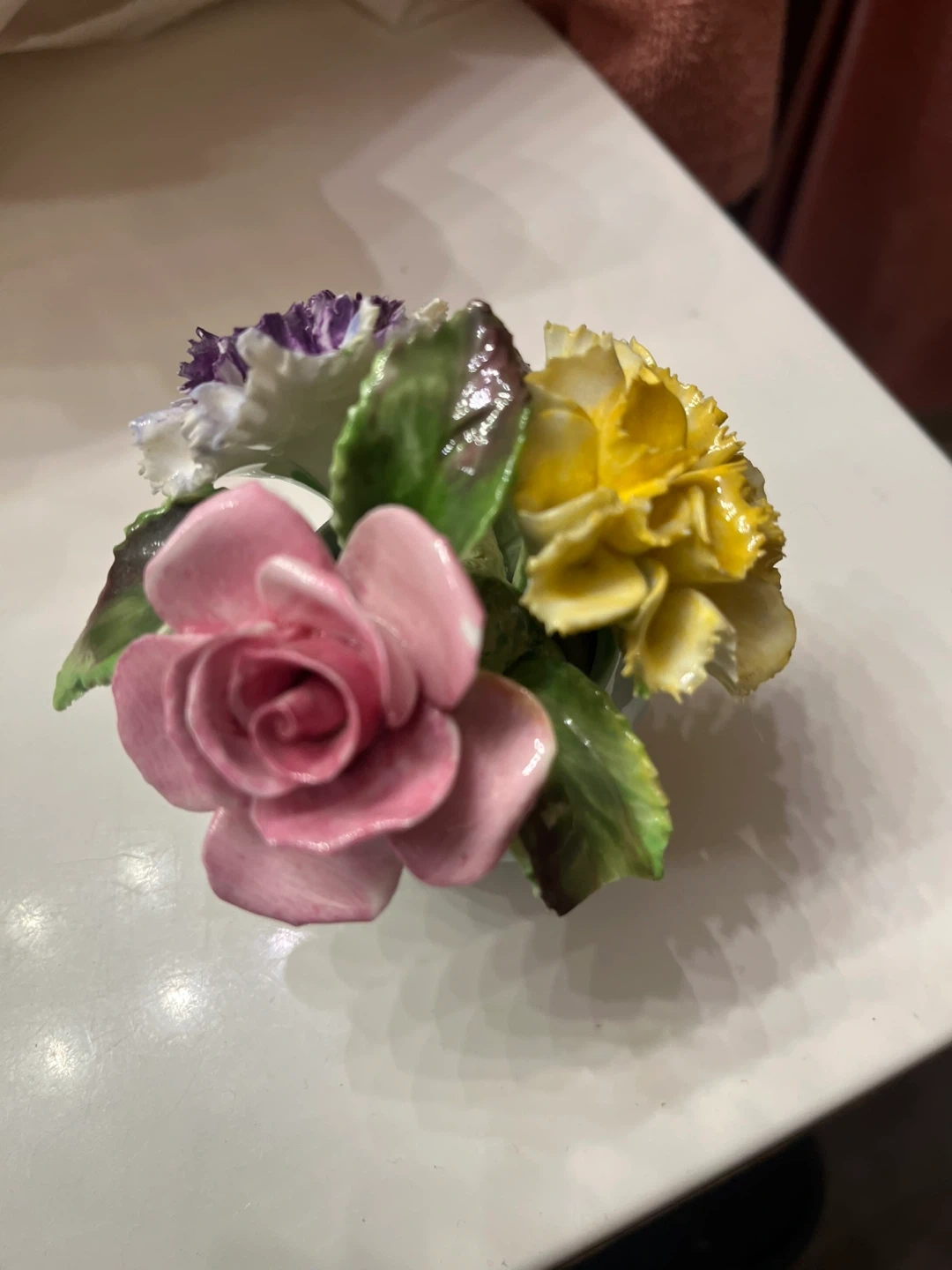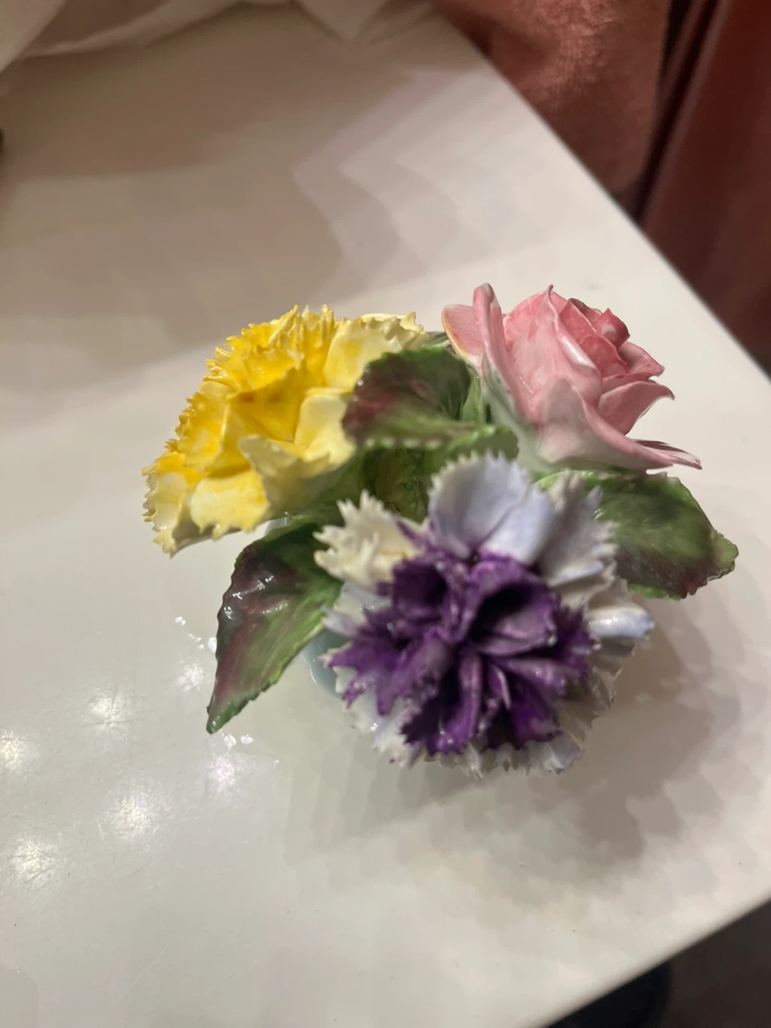 This is a beautiful Handmade Bone China Floral arrangement figurine. It features a trio of blossoms- a pink rose and two carnations, yellow and purple. The workmanship is stunning, and must be seen to be appreciated.