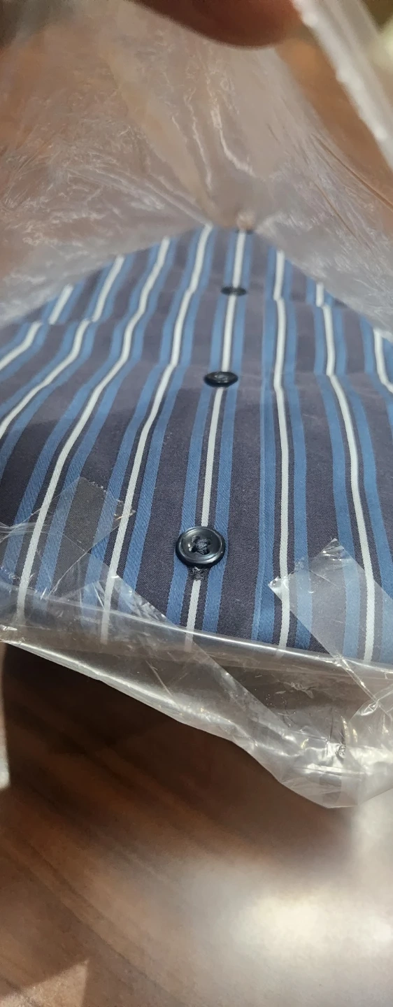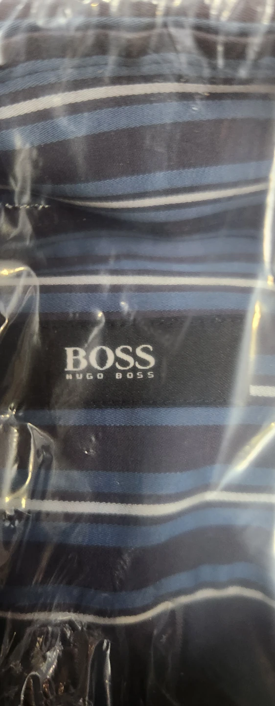 Here's a Hugo Boss striped shirt! It's in great condition and still in its original packaging. The shirt features a stylish striped pattern in shades of blue and white. Perfect for adding a touch of sophistication to your wardrobe