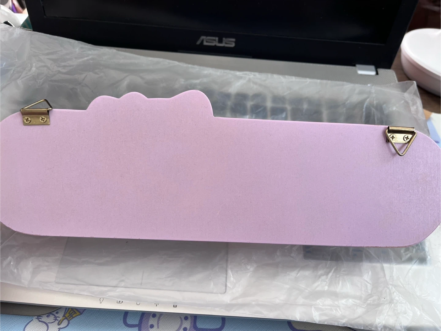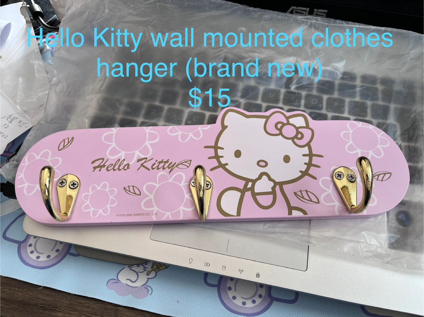 I have a brand new Hello Kitty wall mounted clothes hanger for sale! It's a cute and functional addition to any room. It's pink with a Hello Kitty design and gold-coloured hooks