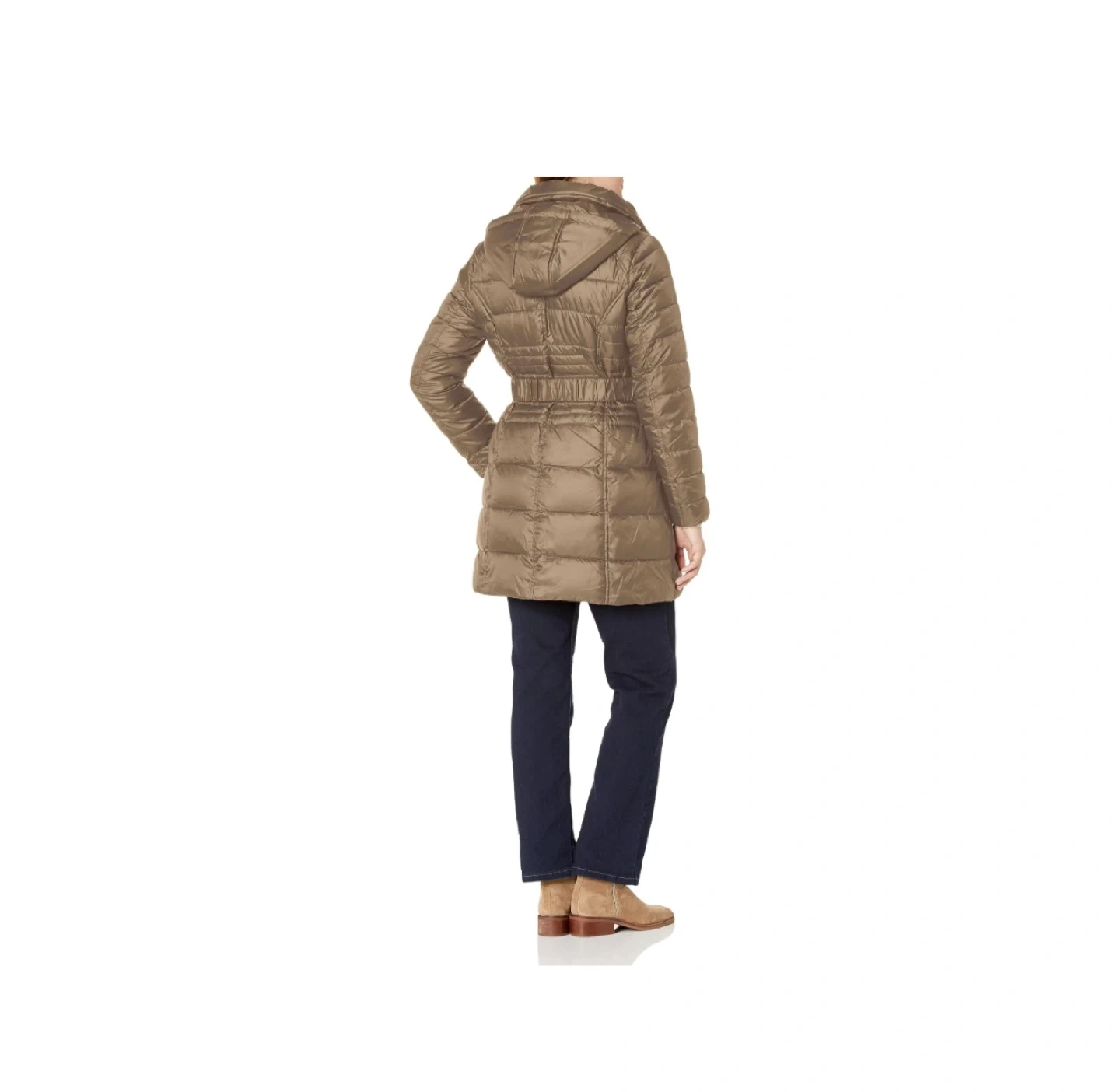 Here's a stylish belted puffer coat in a lovely brown colour. It's perfect for staying warm and fashionable during the colder months. The belted design adds a flattering silhouette to this cozy coat. It's in great condition and ready for a new owner! Hardly used once